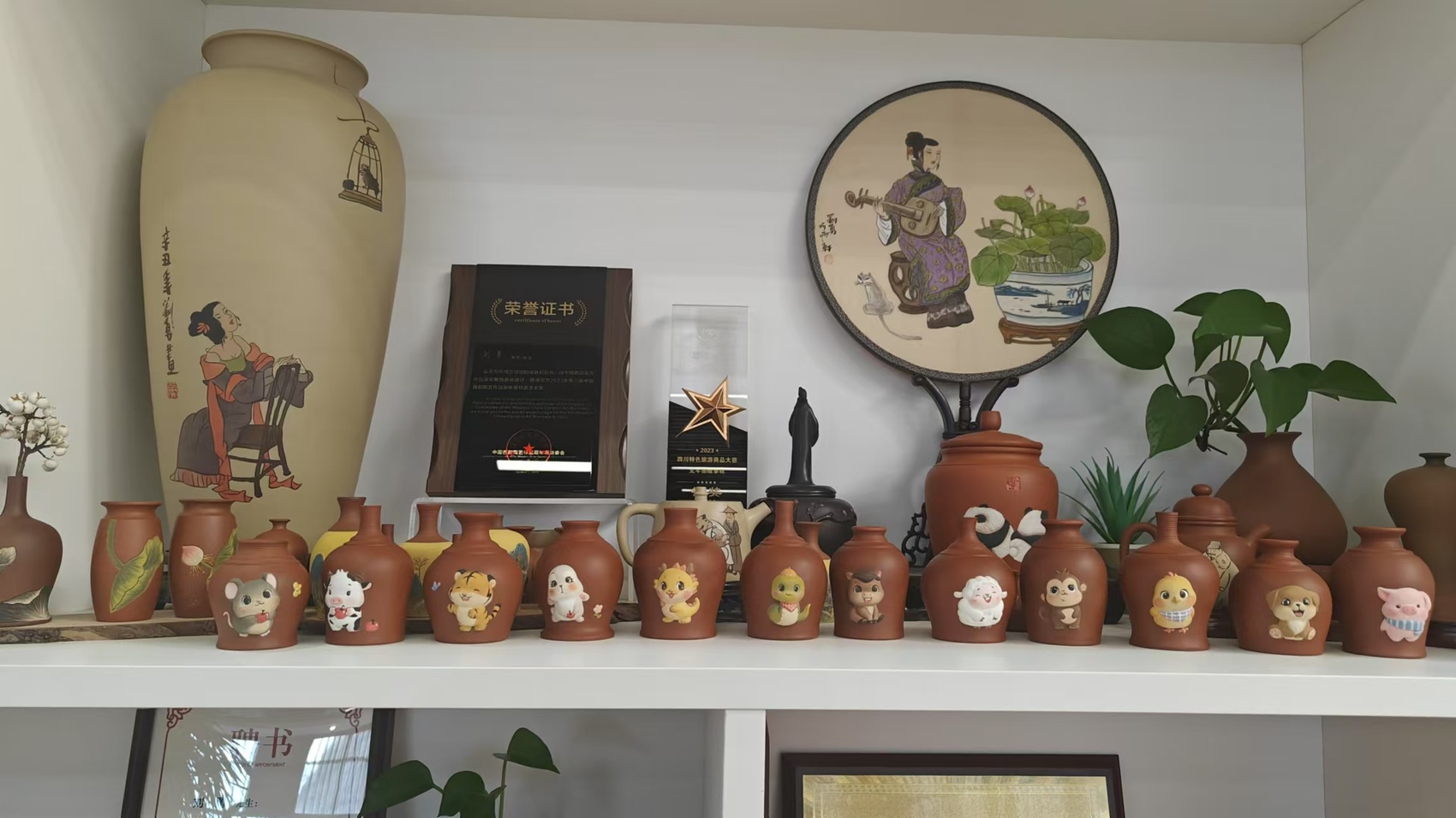 这里面有从2022年开始设计的东坡家酒酒坛,1斤到5斤规格均有,上面文化名人形象生动,艺术性颇高;陶体绘有荷叶的五粮液酒坛,寓意着和和美美,手工烧制陶盖与陶口完美贴合,不用加密封圈就能很好地实现气密性……此外还有展会展览使用的文创酒坛,造型独特,制作精美,成为刘勇团队以及整个荣县陶产业发力重要领域。