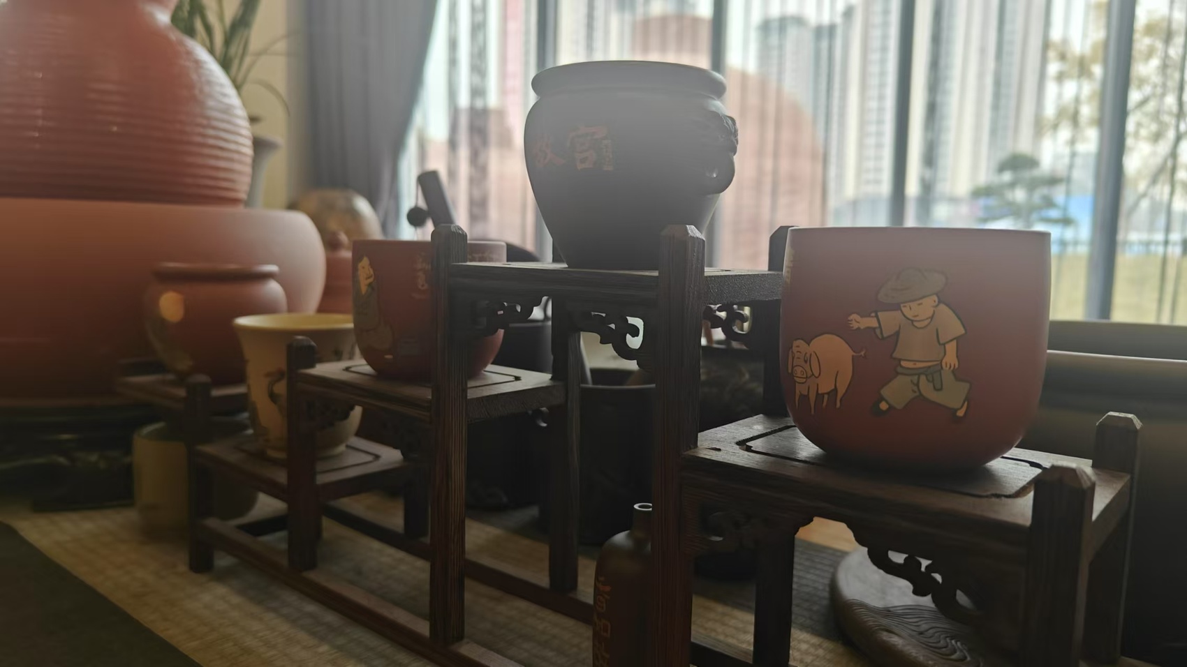 “荣县被称为‘陶都’,就是因为这里的陶土资源分布集中、分层清晰、取用方便,而且品类丰富。”著名画家、陶瓷艺术家刘勇刚刚完成了两幅水墨画,丹青墨宝最终将呈现在下一批茶具、泡菜坛、酒坛等土陶器具上。