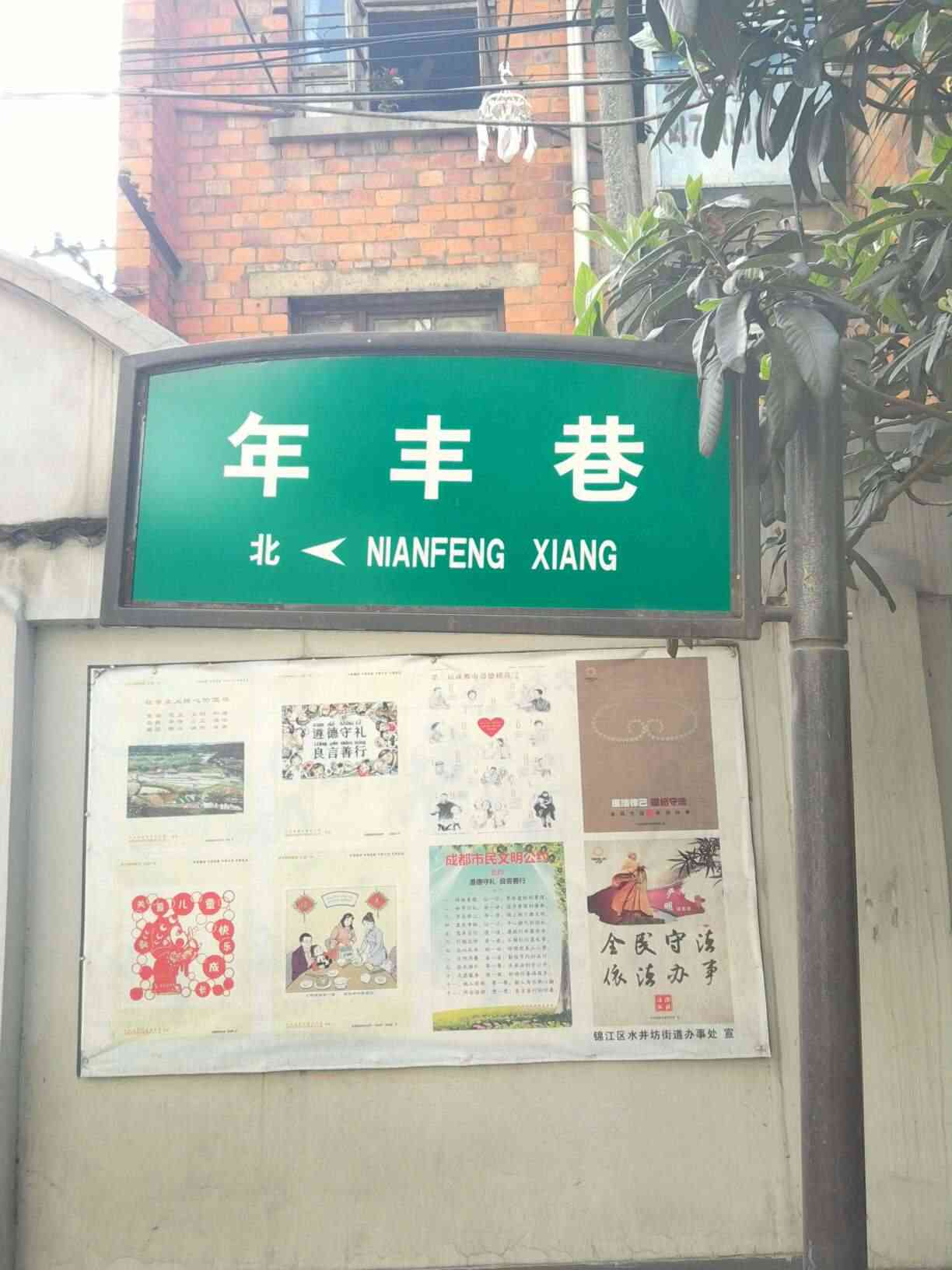 晚清《唱成都》歌谣中有“椒子街上好烧酒,牛王庙里有铁牛。菜市场在年丰巷,一洞桥过牛市口。”年丰巷,是成都市内古街巷,清乾隆五十一年(公元1786年)即得名,巷内原有东门菜场,年丰寓意衣食无忧。