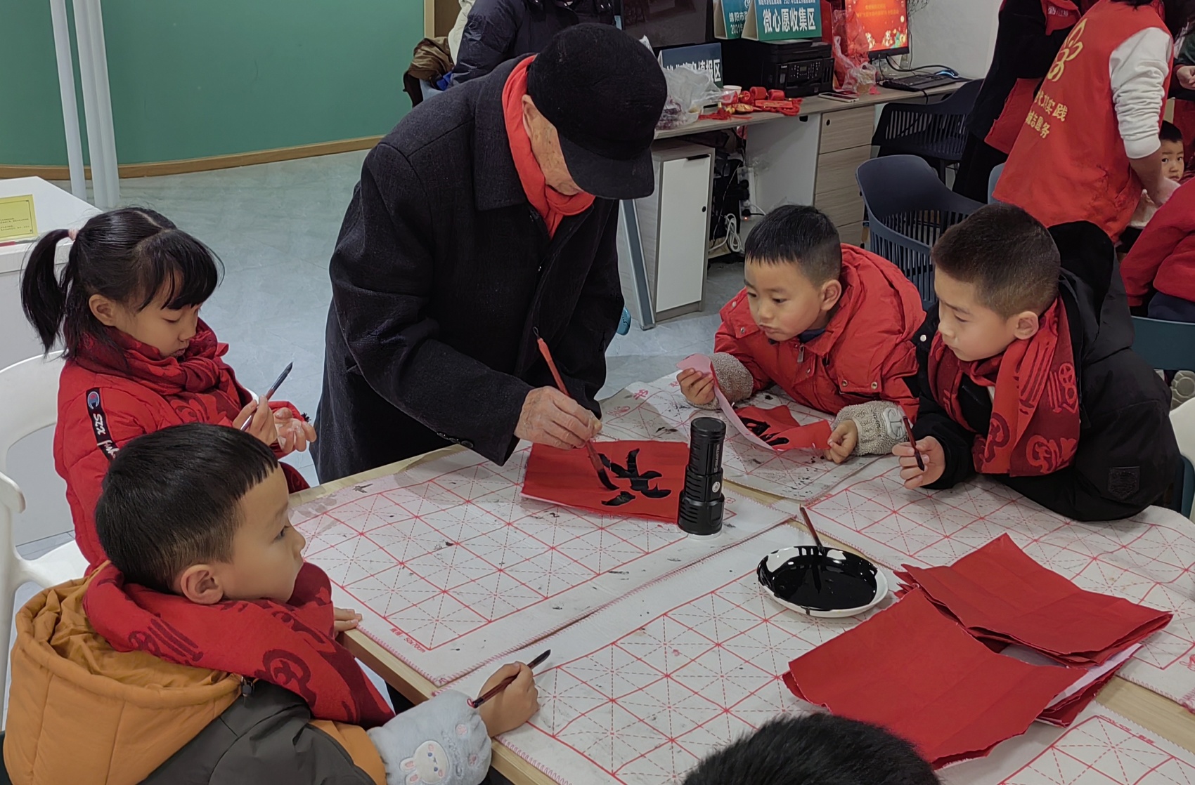 为了准备好这场活动,当地社区早早就与志愿者们精心设计了课程。当天9点,社区“新乡贤”郭光寿带上笔墨纸砚来到社区新时代文明实践站,他擅长书法,这次“客串”春联老师,“希望通过活动能让孩子们体会到中国书法艺术的博大精深,感受中国汉字之美。”郭光寿说。