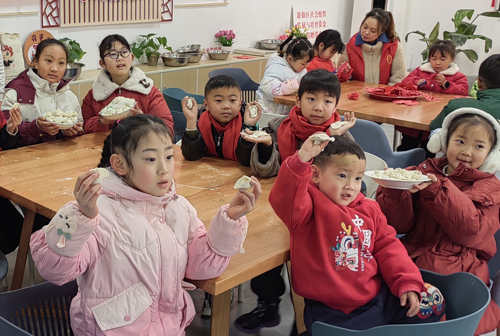 在剪窗花的小分队里,桂花社区巾帼志愿者杨进霞先给小朋友们讲解了春节剪窗花习俗的由来,接下来在动手演示环节,她又细致地给大家讲解动作要领。隔壁桌的写对联小分队,则忙着用笔写下对新年的美好祝愿,对面的桌子上,几个“形态各异”的饺子已经成型,看着志愿者们的尽力补救,大家都忍不住笑出声来。