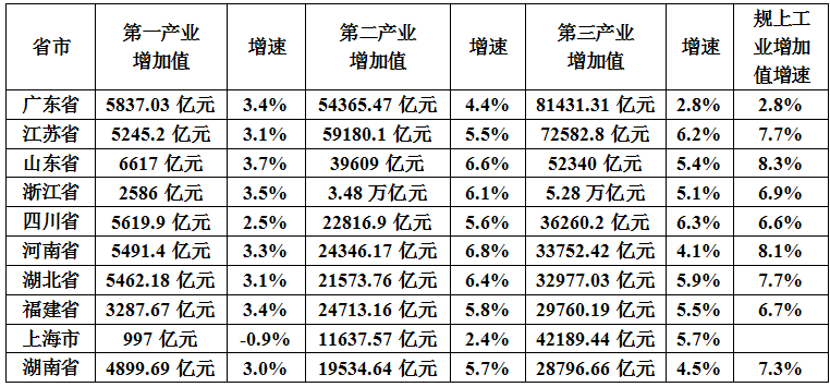就各省市三次产业占比而言,农业在本省市GDP占比中超过8%的有4个,湖南(9.2%)、湖北(9.1%)、四川(8.7%)、河南(8.6%);第二产业占比超过40%的有3个,江苏(43.2%)、福建(42.8%)、山东(40.2%);第三产业占比超过55%的有4个,上海(78.2%)、浙江(58.6%)、广东(57.5%)、四川(56%)。