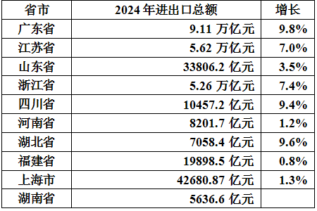 值得注意的是,拉动我国经济增长的“三驾马车”——投资、出口、消费,其中的出口在应对贸易摩擦中依然稳健有力。2024年中国全年进出口总额达到43.85万亿元、同比增长5%,其中十大经济省市实现32.76万亿元,占全国比重为74.7%。