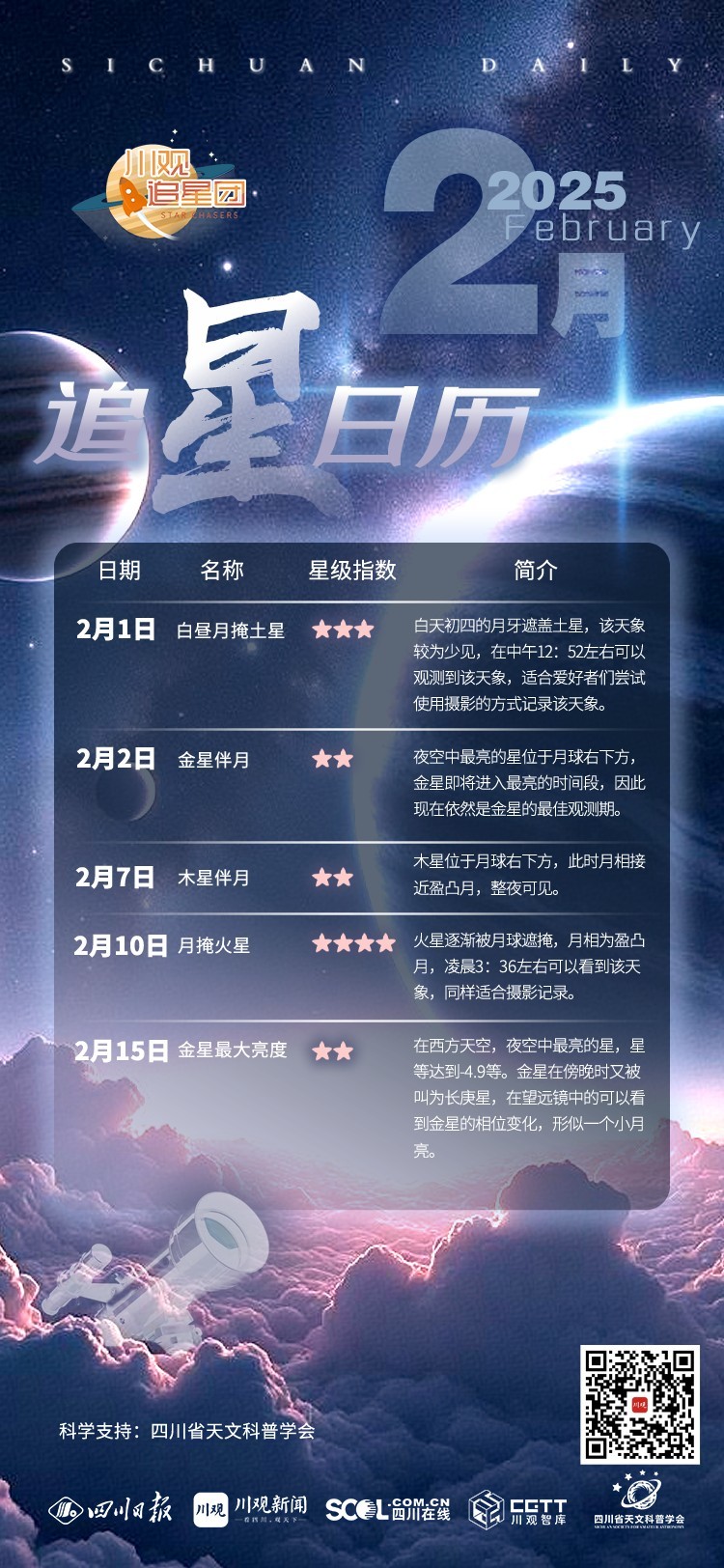 2月的星空将会有月掩火星、白昼月掩土星、金星伴月等“好戏”浪漫上演,为蛇年增添好运。