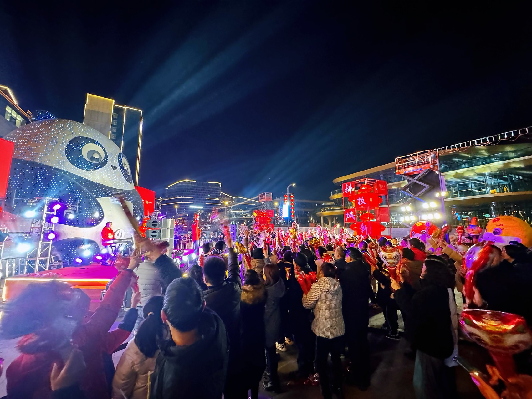 “拜年啦!拜年啦!”1月26日晚,绵阳科技城新区上马商圈春晚活动一开场,“绵阳造”人形机器人夸父就向市民拱手拜年,成为晚会当之无愧的“明星”。随后,伴随着喜庆的音乐,新春开场舞、川剧变脸、舞龙、“赶年兽”等节目和活动也轮番上演,晚会现场,真人献唱加机器人集体伴舞,更是将科技与年味完美融合,让现场观众大开眼界。