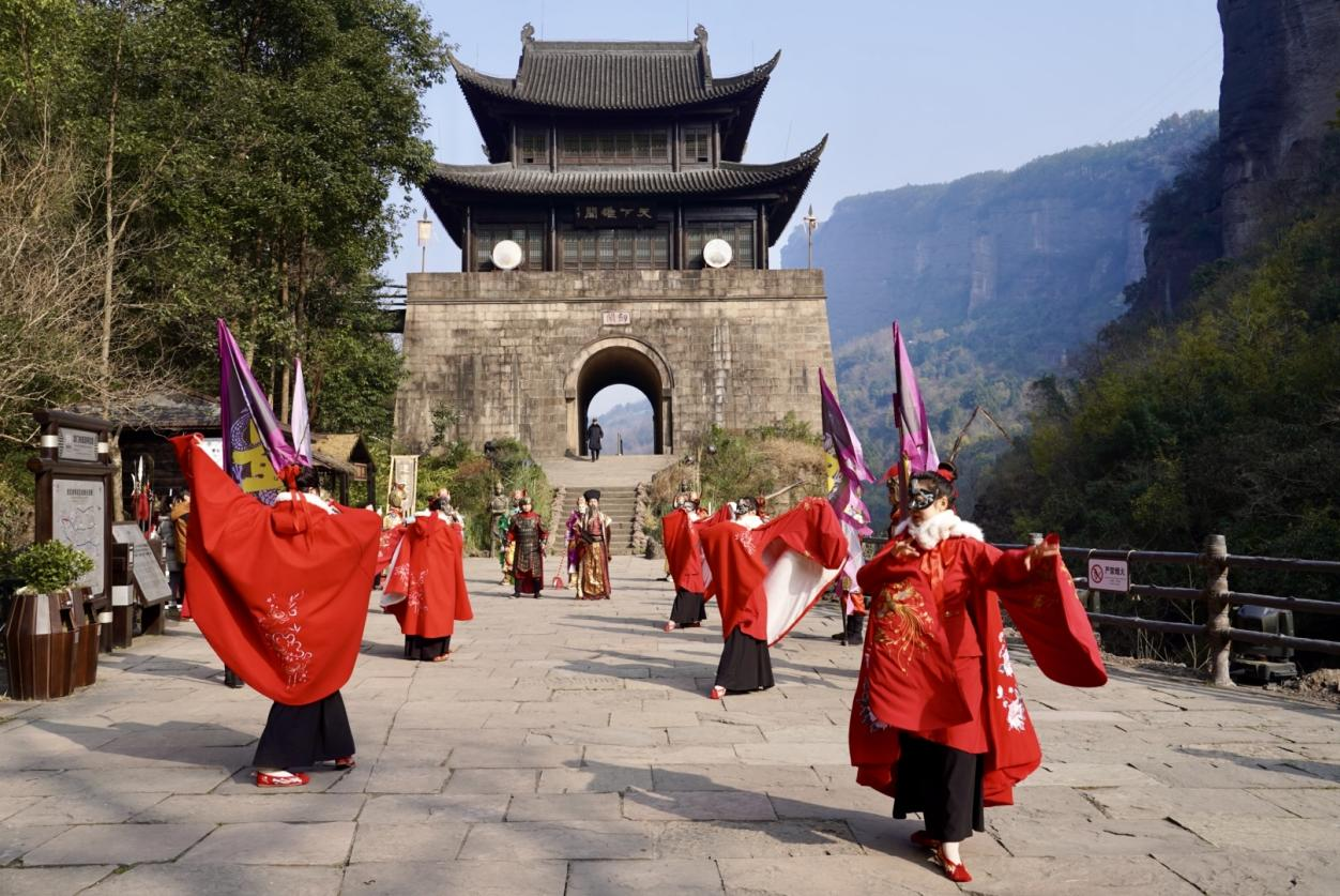 国外游客走进剑门关,聆听六出祁山、九伐中原、蜀汉灭亡等重要三国历史事件故事,查看当地仍留存有三国古战场、姜维祠等文化遗存、遗址,参与《开关仪式》情景剧表演,直观地感受三国历史。