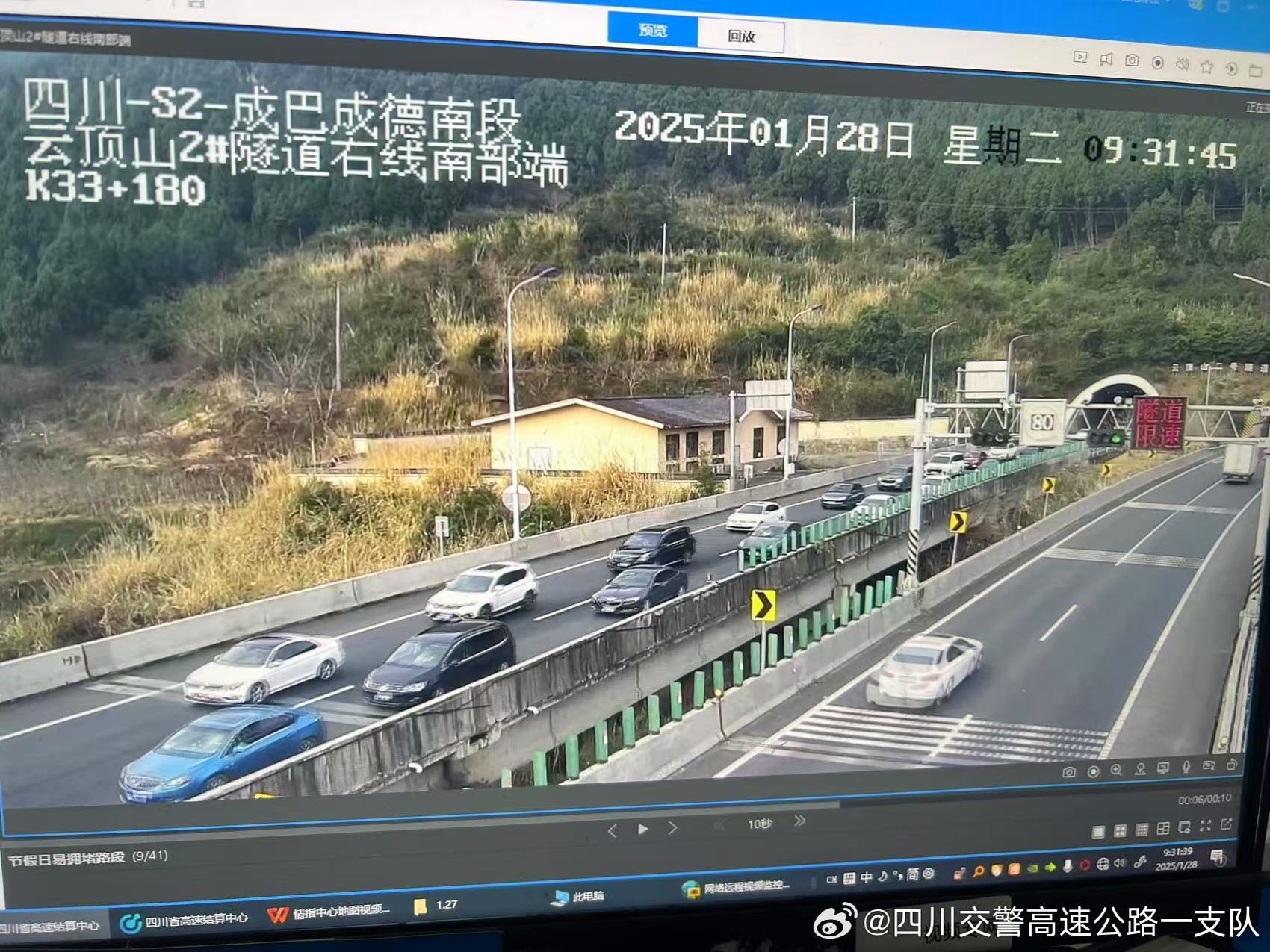S2成巴高速(成德南高速):出城方向云顶山隧道车多缓行;