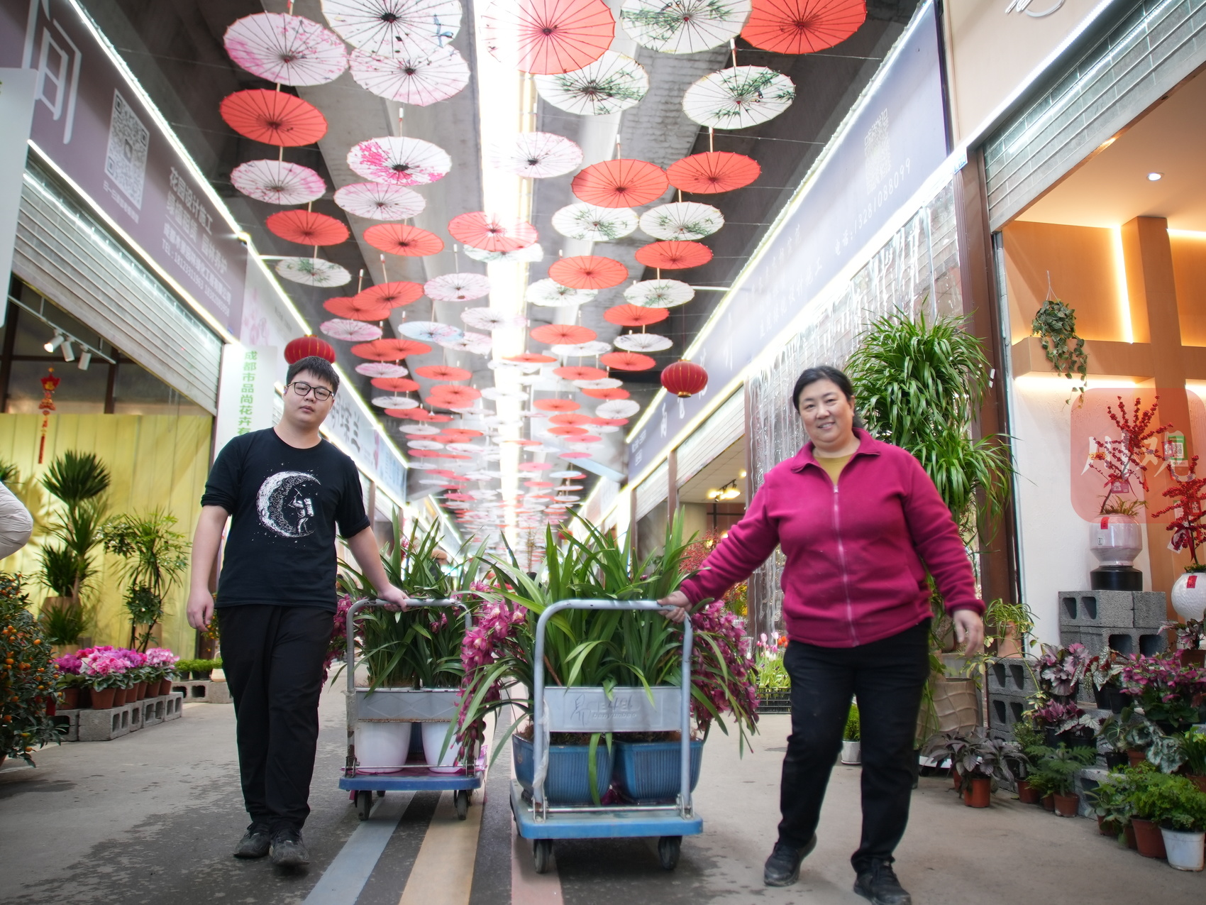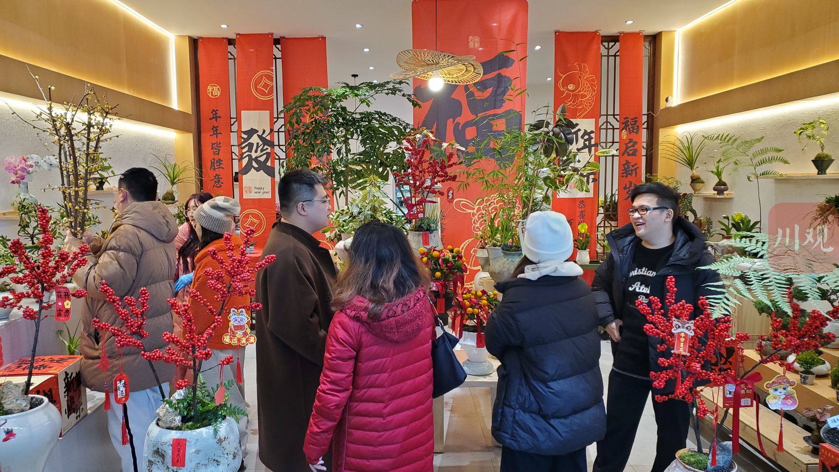 除了用作装饰的花卉,年底也是盆景的销售旺季。商户唐糖一上午卖出去好几盆“迎客松”,“八方来客八方来财,不管是摆放家里还是用于走亲访友,都是很好的选择。”
