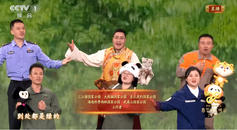 2025年是“两山”理念提出20周年。春晚合唱歌曲《我的家》中,四十多位全国林草基层工作者代表共唱“我的家,到处都是绿的”,展现20年来对“绿水青山就是金山银山”理念的生动实践,其中就有来自四川的大熊猫国家公园卧龙片区工作人员王关文和大熊猫国家公园荥经县管护总站科研监测负责人付明霞。舞台上,他们手中的熊猫“福宝”玩偶更是让观众们直呼“太萌了!”