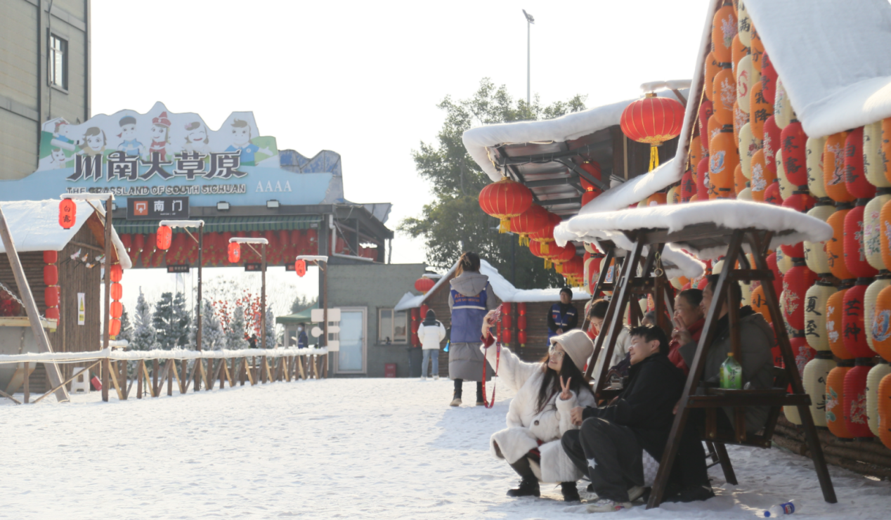 来自四面八方的游客络绎不绝,游客们一进入景区,便被眼前的雪景所吸引。景区通过人工降雪设备和各种雪景装饰,打造了一个梦幻般的冰雪世界。南门入口处数百平方米的区域被白砂、白布和人造飘雪装点得如诗如画,成为游客们拍照打卡的热门地点。大家纷纷拿出手机或相机,记录下这难得的美景,为新年的美好回忆增添一抹亮色。