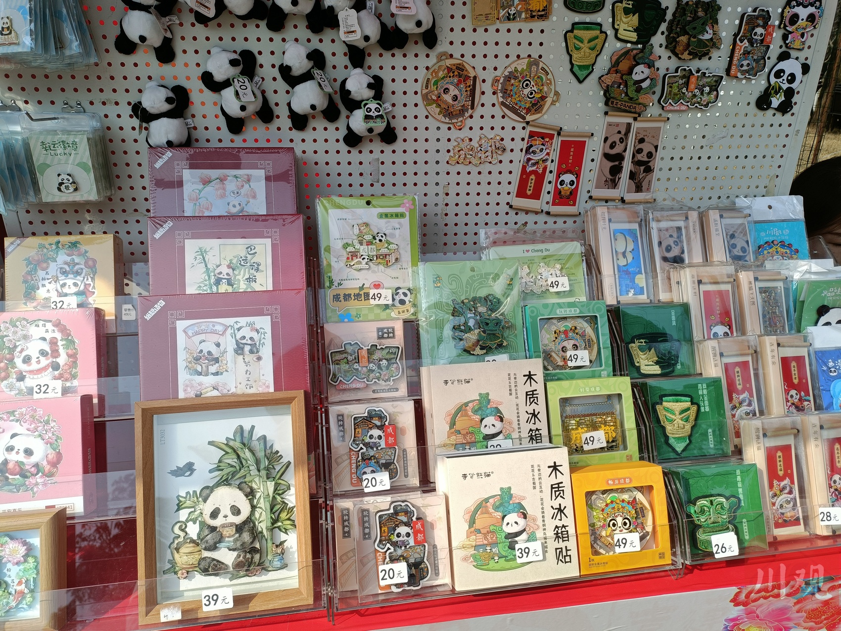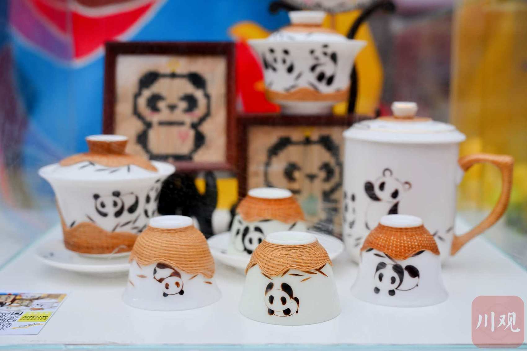 在文创产品区,集市上还有各种特色礼品和生活用品,游客在大饱眼福之后,纷纷可爱的“熊猫”带回家。在文创产品区的中央,一个巨大的展示台上摆放着一系列以熊猫为主题的手工艺品。这些手工艺品包括了用竹编技艺制作的熊猫摆件、蜀绣熊猫屏风,以及用陶瓷烧制的熊猫茶具、熊猫香薰、熊猫创意果盘等。