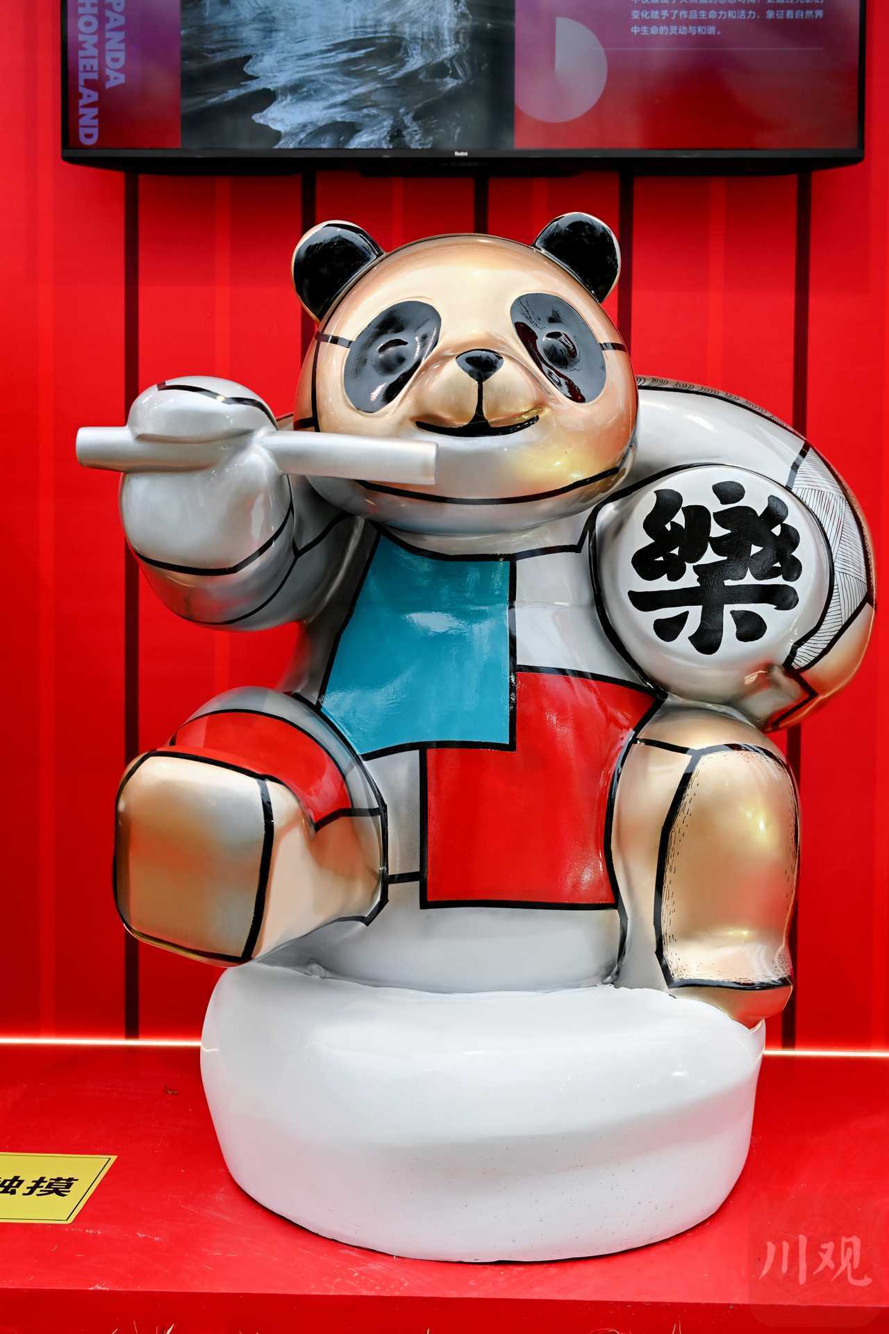 “这只熊猫叫‘熊鼓鼓’,很多游客都喜欢它。”据活动主办方相关负责人介绍,这只“熊鼓鼓”的造型创意来自汉代的“说唱俑”,巧妙地将说唱俑的表情和神态与大熊猫的形象相结合,仿佛一只大熊猫正在舞台上表演说唱,充满了幽默与活力。“‘说唱俑’是一件极具成都文化特色的文物,展现了古代艺人表演时的生动场景,希望这只大熊猫不仅能展现出大熊猫的可爱,还能传递出传统文化的深厚底蕴。”