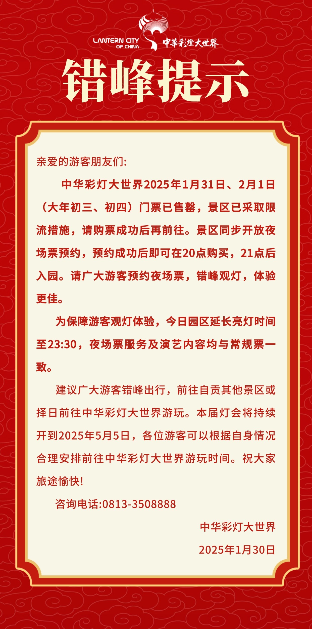 1月30日,自贡中华彩灯大世界发布通告:2025年1月31日、2月1日(大年初三、初四),第31届自贡国际恐龙灯会门票已售罄,景区已采取限流措施,建议游客购票成功后再前往。