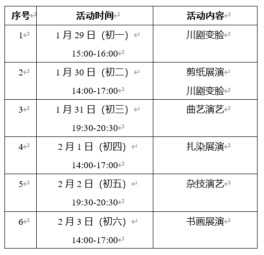 在古香古色的王爷庙内,农历正月初二15:00至16:00,进行川剧变脸、剪纸展演;农历正月初三的19:30至20:30,进行曲艺演艺;农历正月初四的14:00至17:00,进行扎染展演;农历正月初五的19:30至20:30,上演杂技绝活;农历正月初六的14:00至17:00,将推出书画作品展。