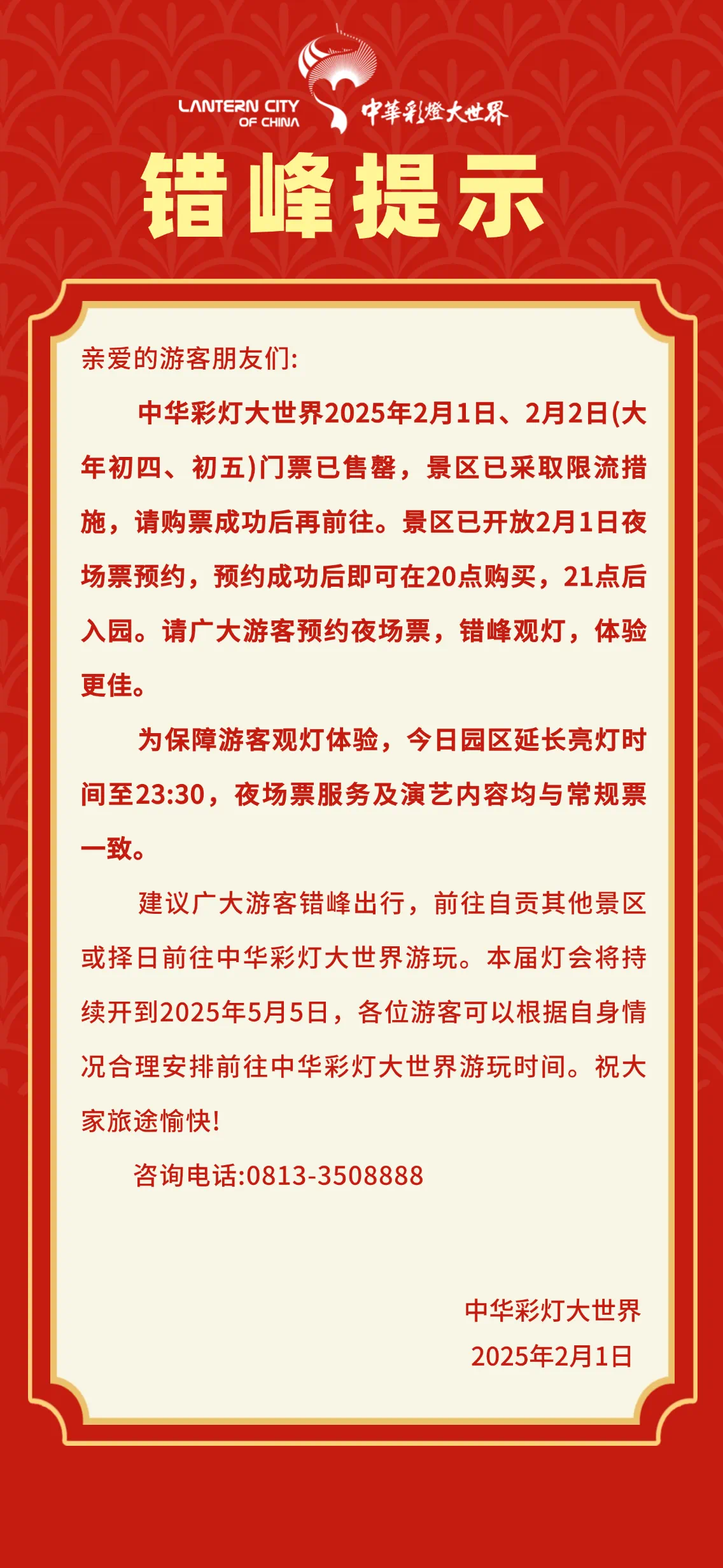 2月1日,自贡·中华彩灯大世界发布通告:2025年2月1日、2月2日(大年初四、初五),第31届自贡国际恐龙灯会门票已售罄,景区已采取限流措施,建议游客购票成功后再前往。