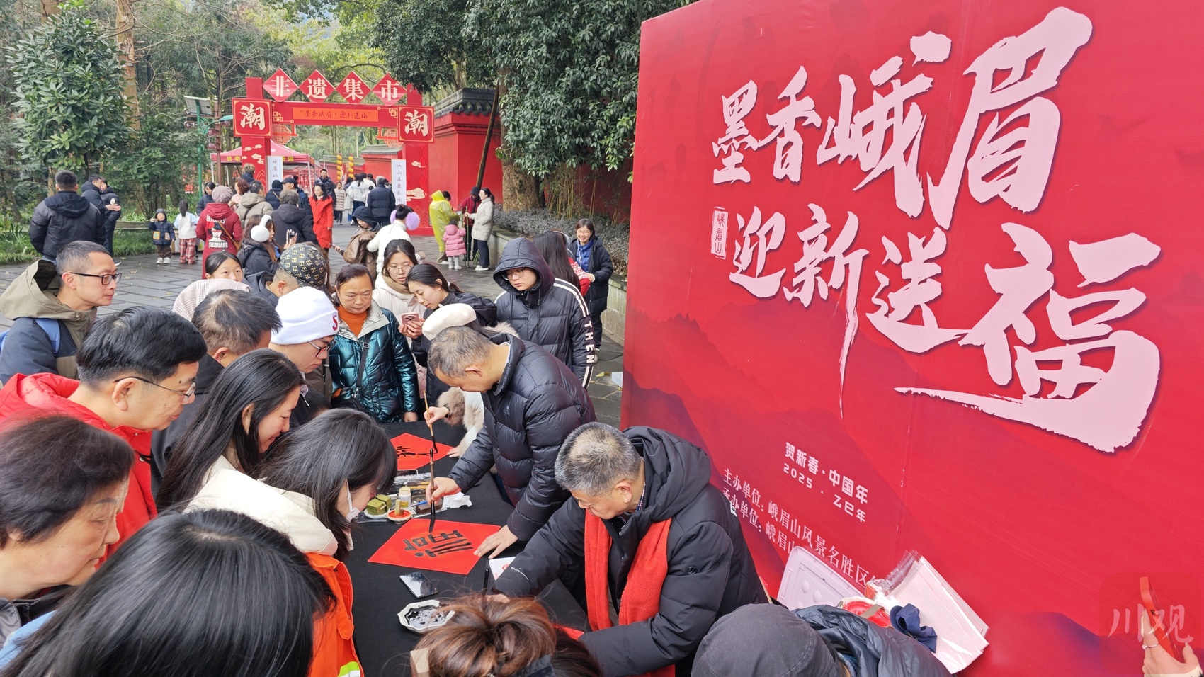 2月2日上午10点,峨眉山景区报国寺广场前,“墨香峨眉、迎新送福”活动火热开展。来自峨眉山市书法家协会的书法家们挥毫泼墨,现场写福,“喜乐安宁”“金榜题名”“心想事成”等美好祝福跃然纸上。恰逢当天是农历大年初五,向来有“迎财神”的习俗,因此“招财进宝”的组合字最受欢迎。