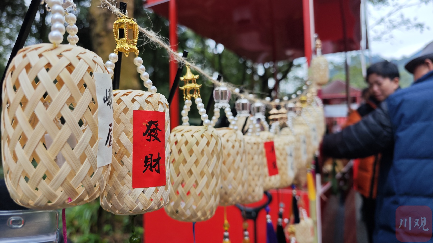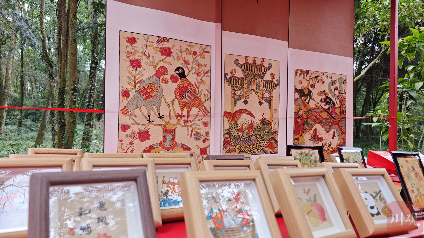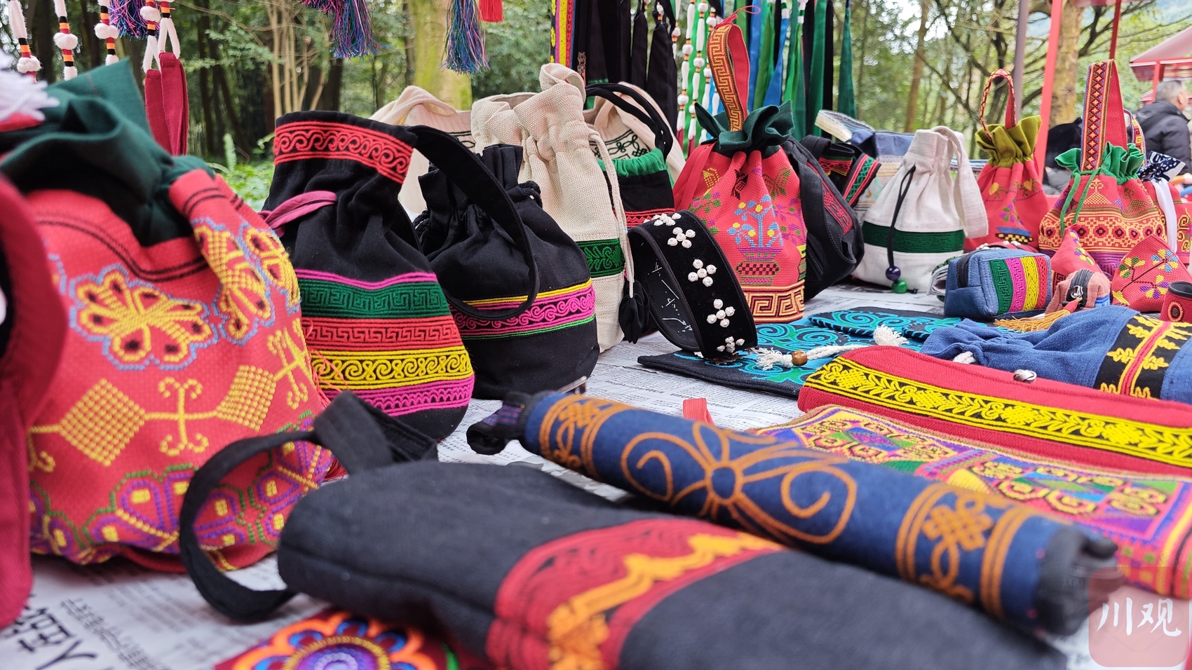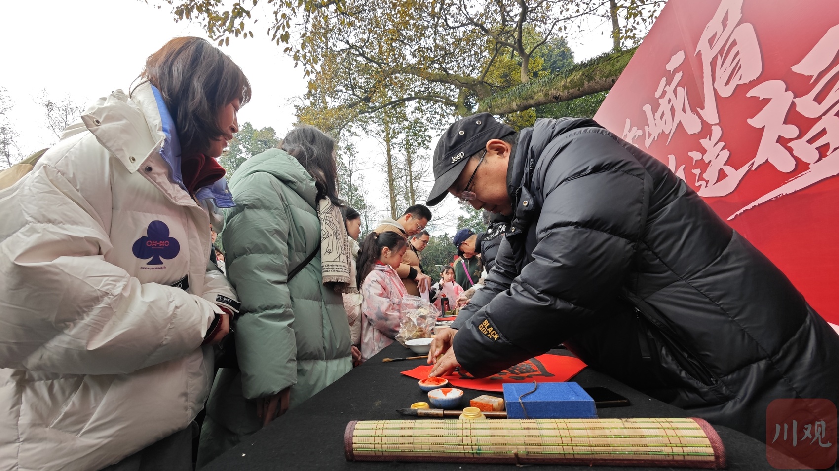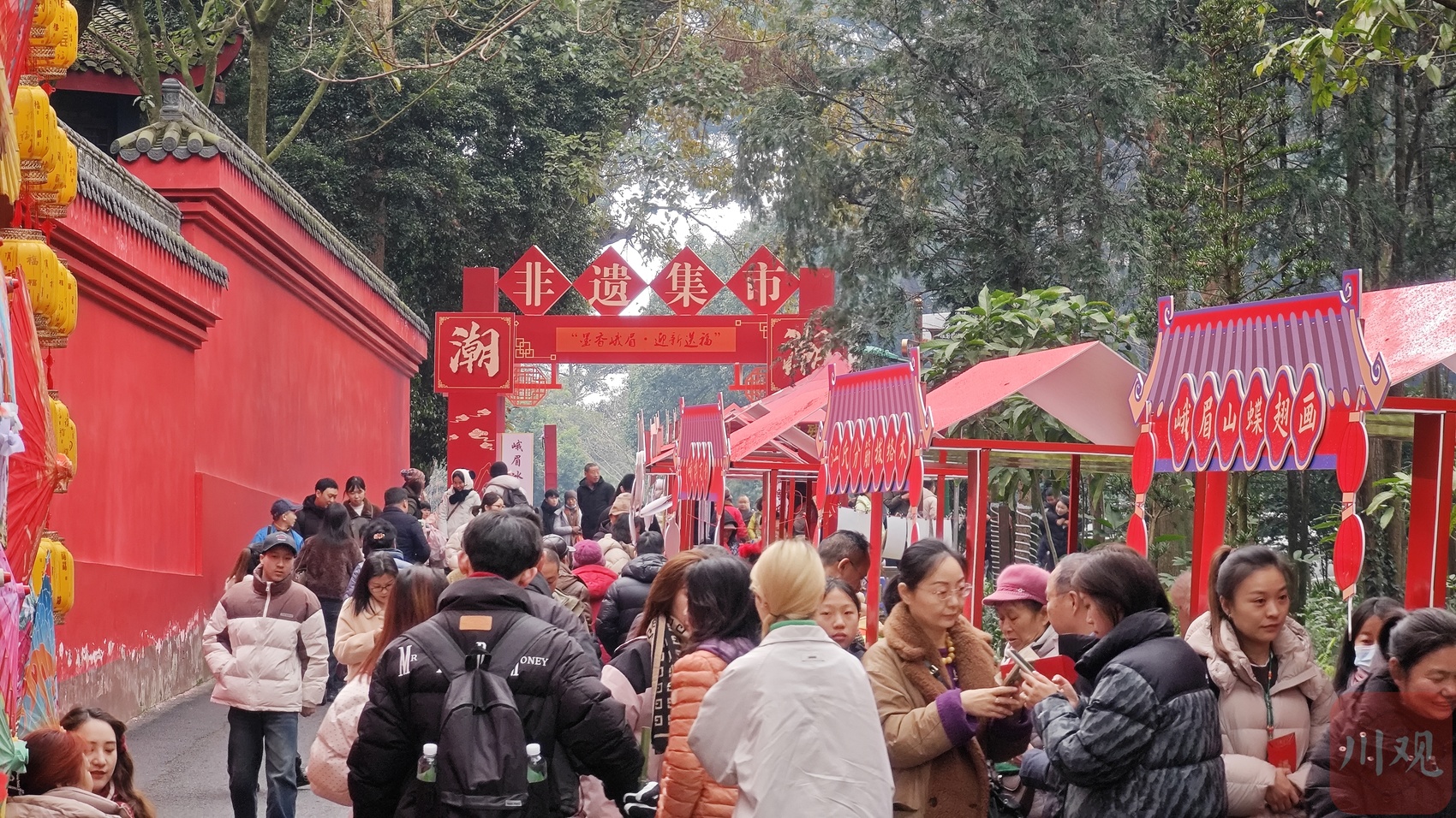 不远处的非遗集市同样人气爆棚。峨眉武术、夹江年画、彭州白瓷、漆扇等非遗展位依次排开,吸引游客驻足。