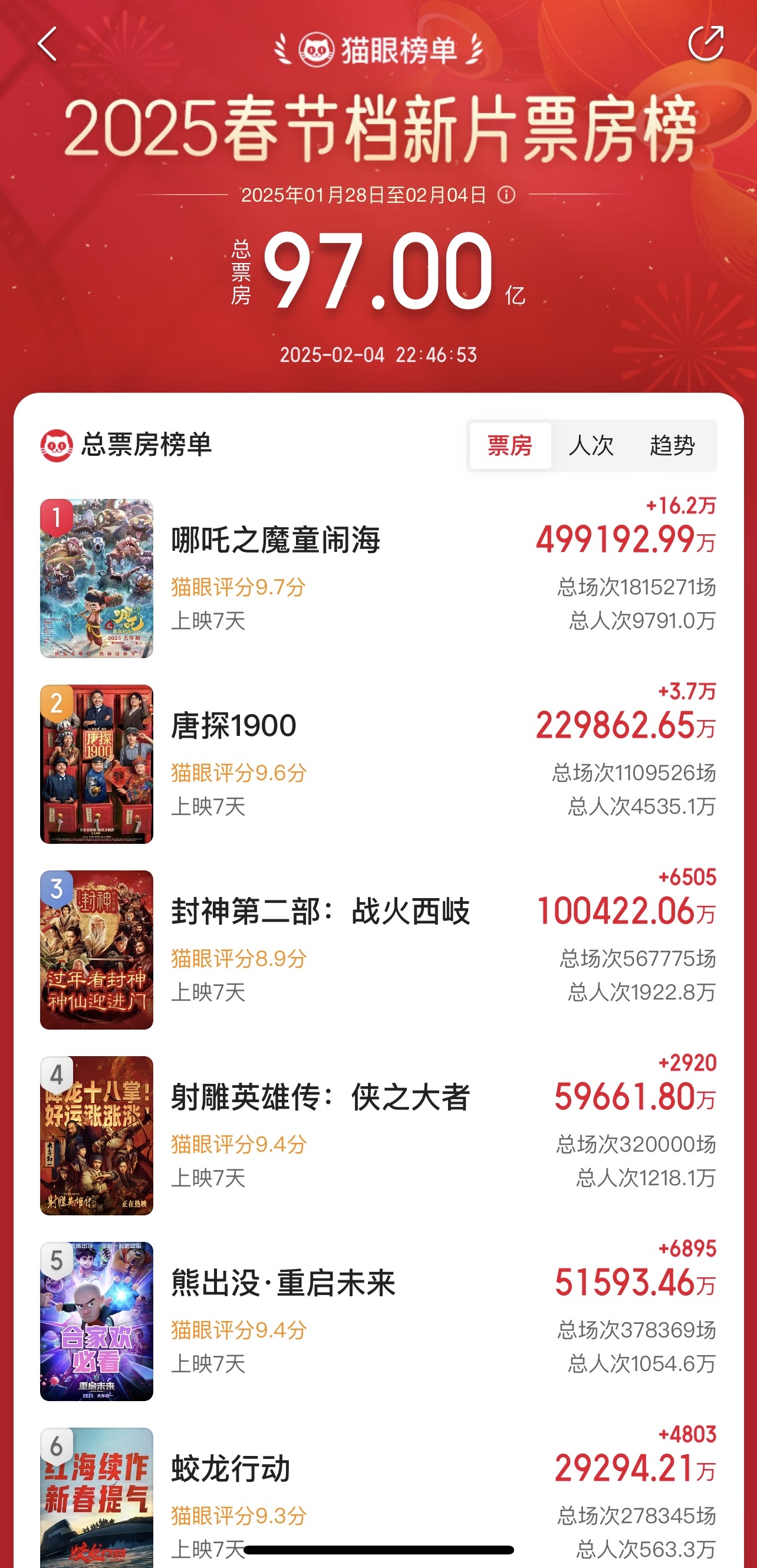 伴随着春节假期落幕,春节档电影票房竞逐也暂告一段落。据猫眼专业版数据显示,截至2月4日22时,2025年春节档票房突破97亿,大幅刷新中国影史春节档最高票房纪录,观影人次超1.8亿,同样也刷新了中国影史春节档最高人次纪录。其中,《哪吒之魔童闹海》位列榜首,《唐探1900》《封神第二部:战火西岐》分列第二、三名。