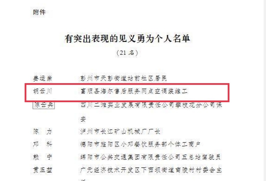 为激励先进、树立典型,根据《四川省保护和奖励见义勇为条例》,12月29日,省政府决定对姜运崇等有突出表现的21名见义勇为个人给予奖励。其中,自贡富顺县海尔售后服务网点维修工胡云川榜上有名。