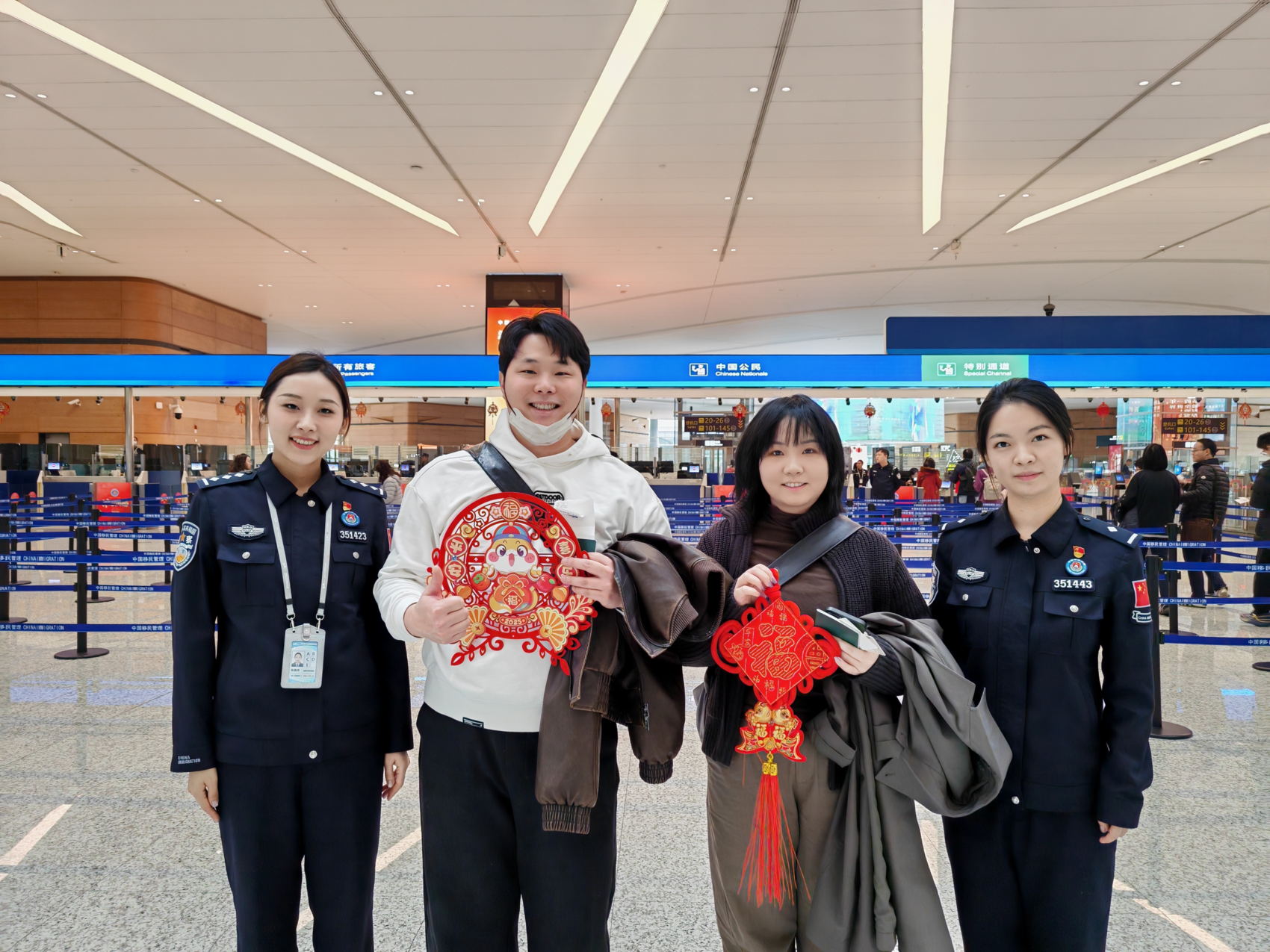 移民管理警察给旅客送春联。 图据四川出入境边防检查总站