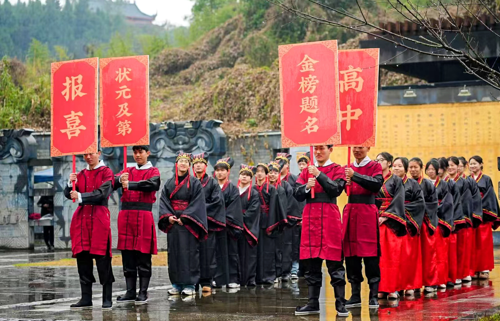 “状元出游!”在金榜园中,经过金榜宣榜、冠袍加身后,“文科状元”头戴璀璨金花、身穿红色冠袍,高坐骏马之上,在书童、衙役的簇拥下巡游,群众纷纷拿出手机拍照,记录这场中状元盛礼。