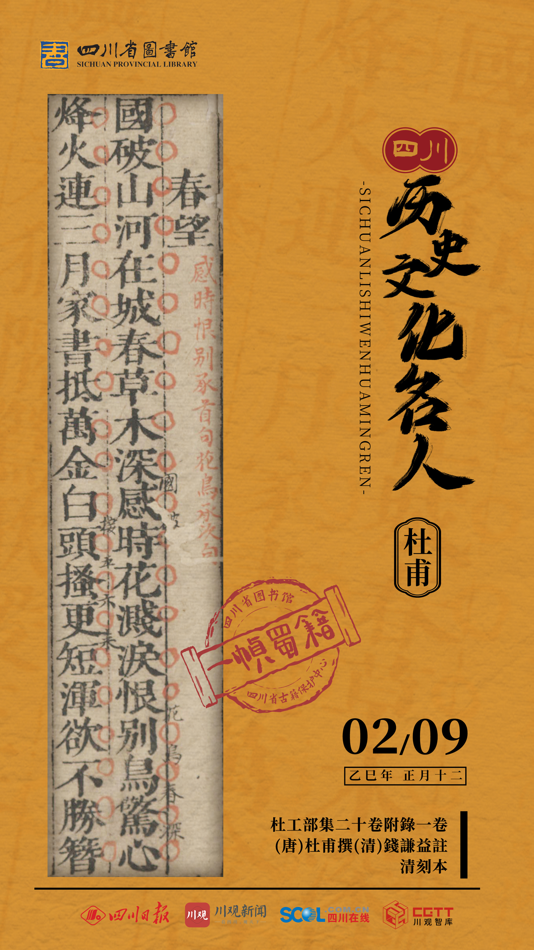 2月9日,一帧蜀籍邀您欣赏《杜工部集》。海报所选用图为《杜工部集》二十卷附录一卷,(唐)杜甫撰,(清)钱谦益注,版本为清刻本。