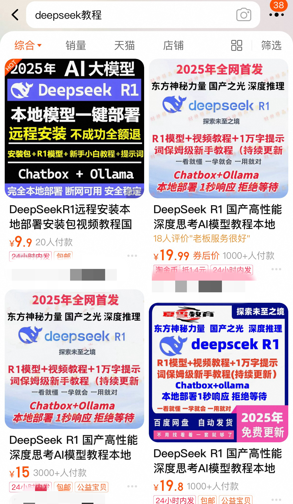 通过浏览页面,记者发现,类似的培训课程不少,种类多元且价格不等。从低至0.1元的“DeepSeek ppt指南”,到售价为699元的“用DeepSeek做自媒体”应有尽有。“靠卖DeepSeek课程资源,我已经赚了2万元了。”淘宝一卖家告诉记者,店铺19.99元的“R1模型+视频教程+1万字提示词保姆级新手教程”,目前已超过1000人购买,主要是售卖一些操作指南和课程资源。