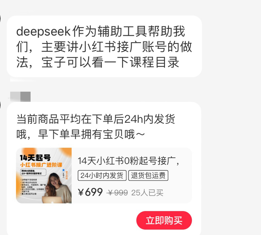 “我们不卖网盘资源,主要是将DeepSeek作为辅助工具帮助用户运营小红书账号。”一位商家告诉记者,该课程售价为699元,具体服务内容包括14节小红书系统视频课程、交流群、一次作业批改,助力客户利用DeepSeek玩转小红书。