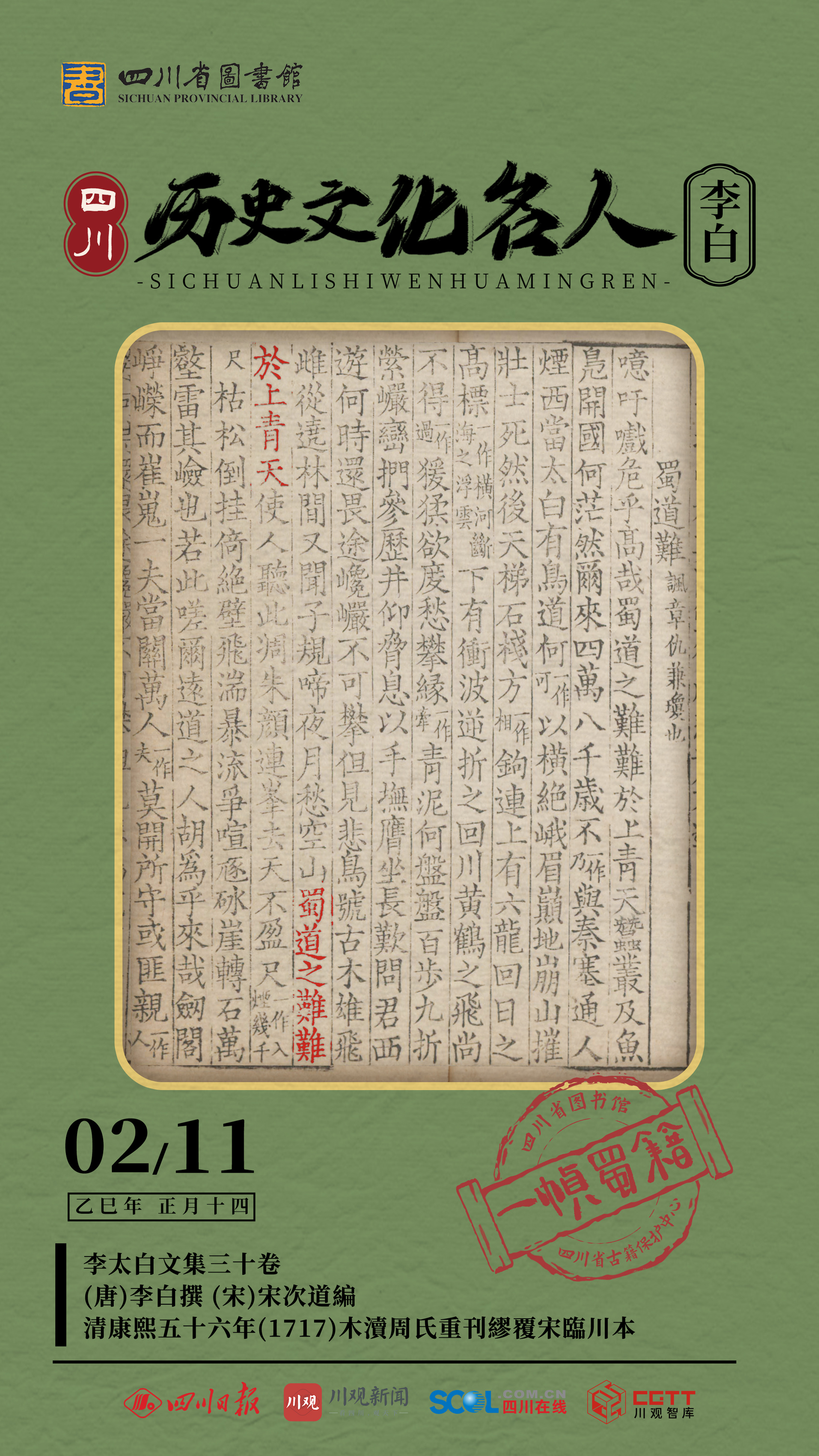 2月11日,一帧蜀籍邀您欣赏《李太白文集》。海报所选用图为《李太白文集》三十卷,(唐)李白撰,(宋)宋次道编,版本为清康熙五十六年(1717)木渎周氏重刊缪覆宋临川本。