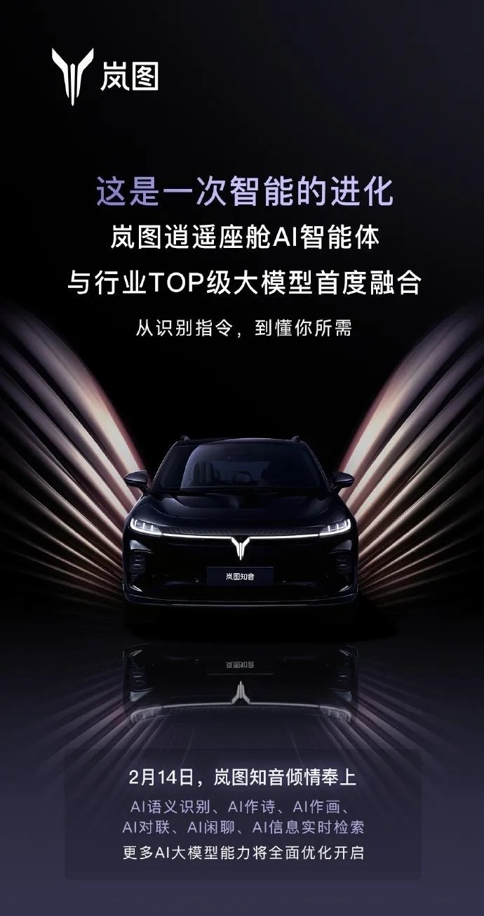 2月7日,岚图汽车官方宣布已完成与DeepSeek模型的深度融合。岚图知音和岚图梦想家将率先搭载岚图逍遥座舱AI智能体,其中岚图知音更是成为汽车行业首个融合DeepSeek的量产车型。2月14日起,岚图知音用户可通过OTA更新体验AI语义识别、AI作诗、AI作画等丰富的AI功能。未来,岚图AI智能体还将在云端持续与DeepSeek R1大模型深度融合,进一步提升语音交互和场景推荐的精准度与灵活性。