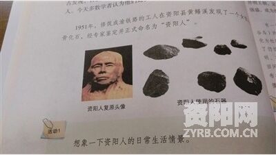 翻开由四川教育出版社2017年出版的《可爱的四川》七年级上册。在第五课《四川的先民》一文,两张图片位于正中。一张是 “资阳人复原头像”,另一张是“资阳人使用的石器”。