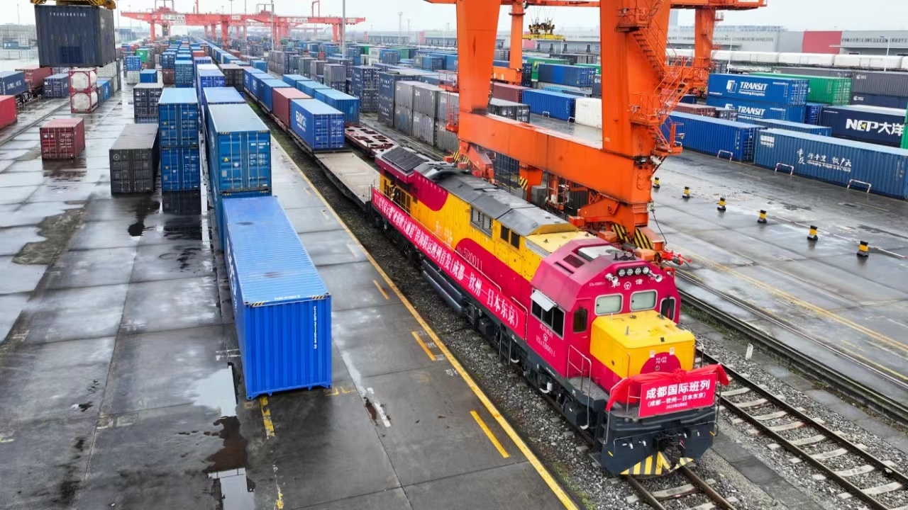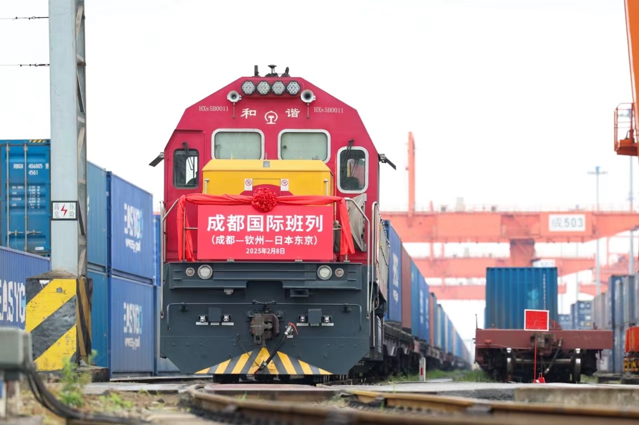 “亚蓉欧大通道”铁海联运班列(成都一钦州—日本东京)发出。