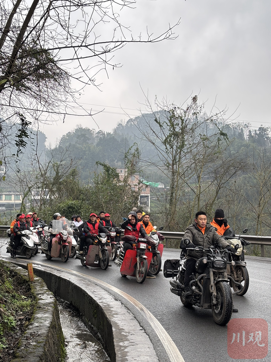 2月9日上午,宜宾市筠连县沐爱镇,通往筠连县沐爱镇“2·8”山体滑坡灾害现场的公路上,一支摩托车队快速驶过。打头的摩托车上,志愿者手举沐爱镇古邑义警落箭分队的旗帜,红色的旗帜在细雨中格外显眼。