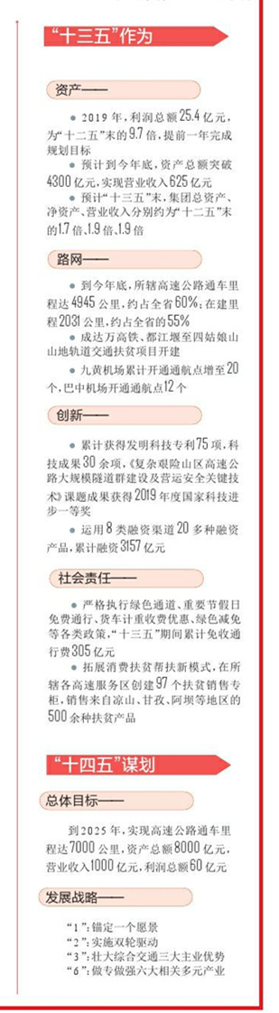 行动的背后是考量。今年9月召开的四川交投集团第一届党委会,响亮提出了今后五年的发展目标:到2025年,实现高速公路通车里程达7000公里,资产总额8000亿元,营业收入1000亿元,利润总额60亿元。