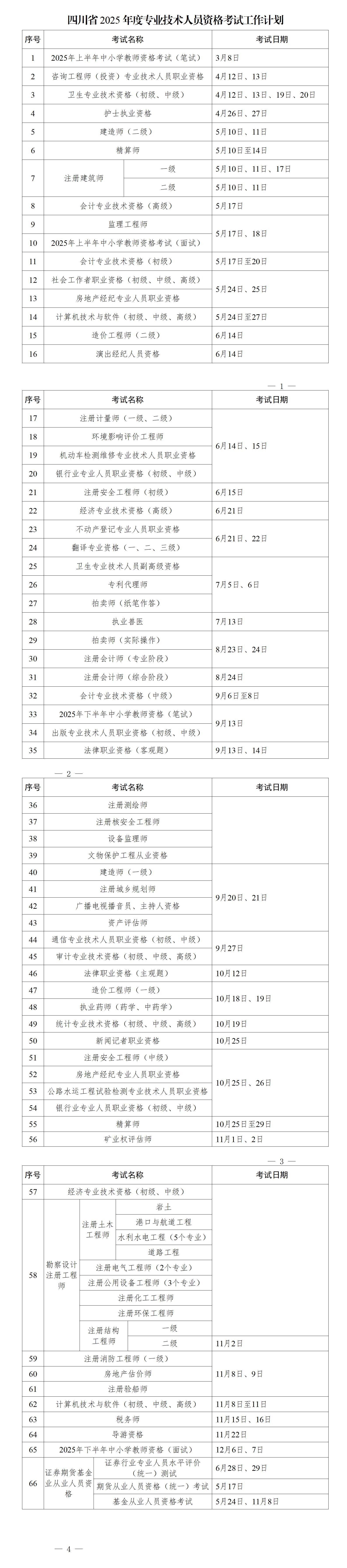 2025年,你想考个什么证?法律职业资格、注册建筑师,还是房地产经纪专业人员、中小学教师资格?四川省人力资源和社会保障厅近日公布四川省2025年度专业技术人员资格考试工作计划及有关事项,快快点击收藏今年的考试时间表吧。