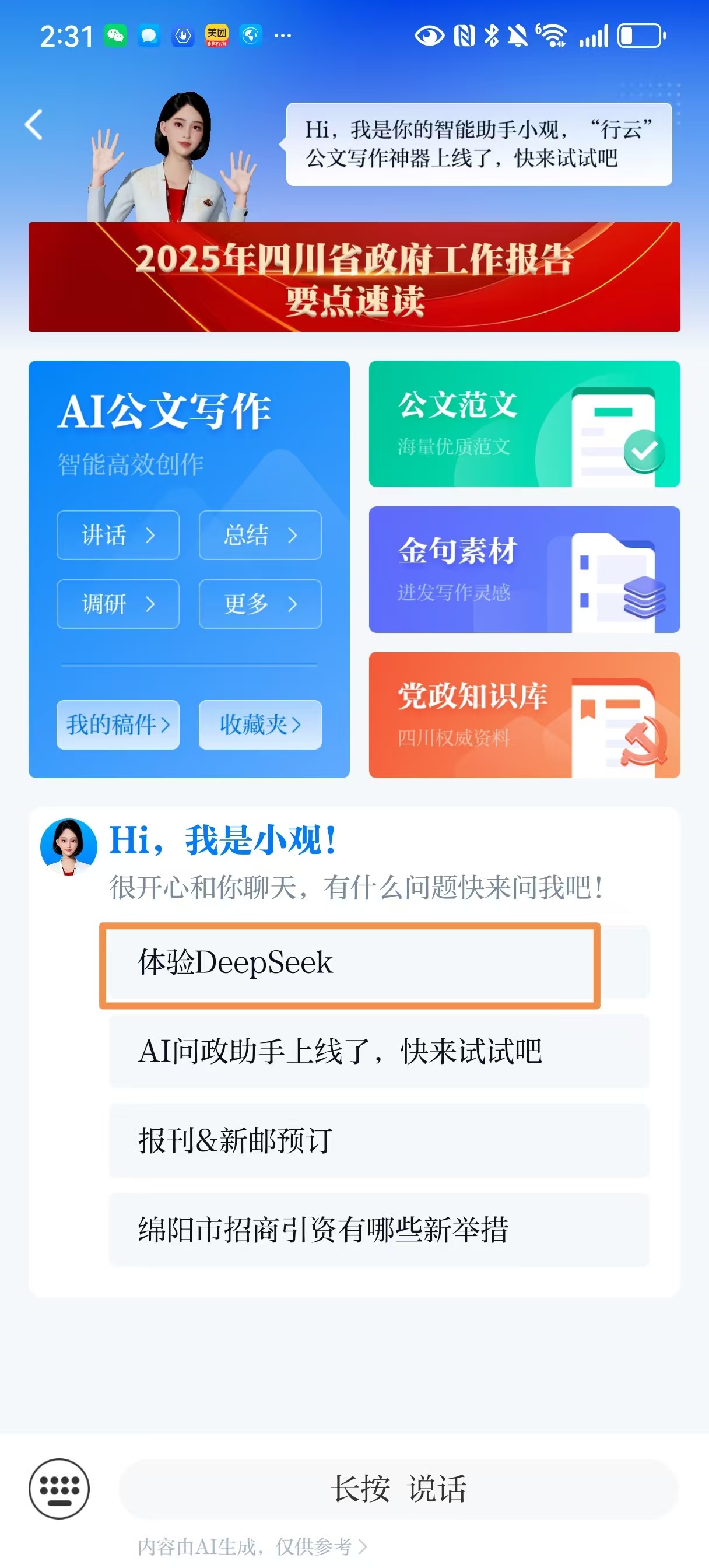 打开川观新闻客户端,单击底部小观AI助手,即可实时体验DeepSeek。依托千亿级参数大模型的精准意图识别能力,小观实现智能语义理解、多轮对话交互等核心技术突破,升级成为更加聪明的“智能体”,提供高质量、可追溯的智库型新闻问答服务,大大提升信息获取效率。针对川观新闻原创报道,小观能够智能标注文章核心观点,生成结构化摘要,帮助用户快速抓取关键信息。