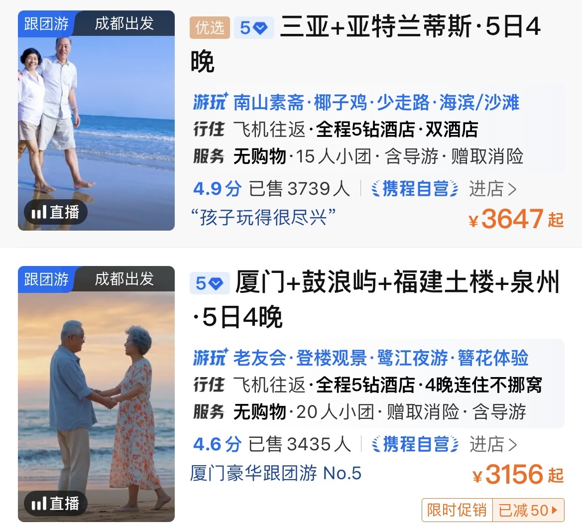 针对银发族群体,各大旅行社和旅游平台也相继推出了老年游客群体的旅游产品。例如,携程旅行APP中,从成都出发的三亚+亚特兰蒂斯5日游、厦门+鼓浪屿+福建土楼+泉州5日游等老年跟团游产品,销量均已突破3000。