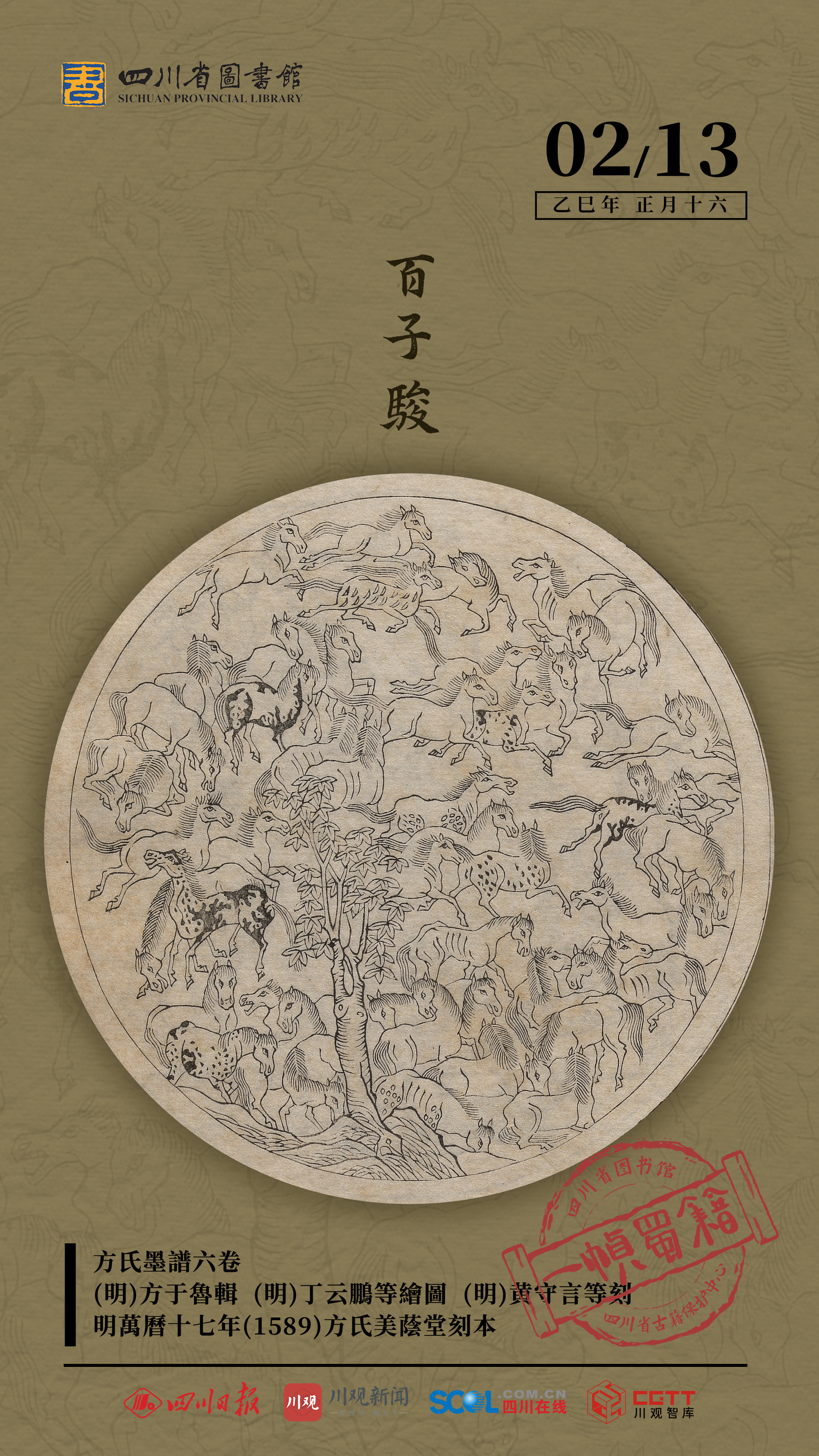 2月13日,一帧蜀籍邀您欣赏《方氏墨谱》。海报所选用图为《方氏墨谱》六卷,由(明)方于鲁辑,(明)丁云鹏等绘图 ,(明)黄守言等刻,明万历十七年(1589)方氏美荫堂刻本。