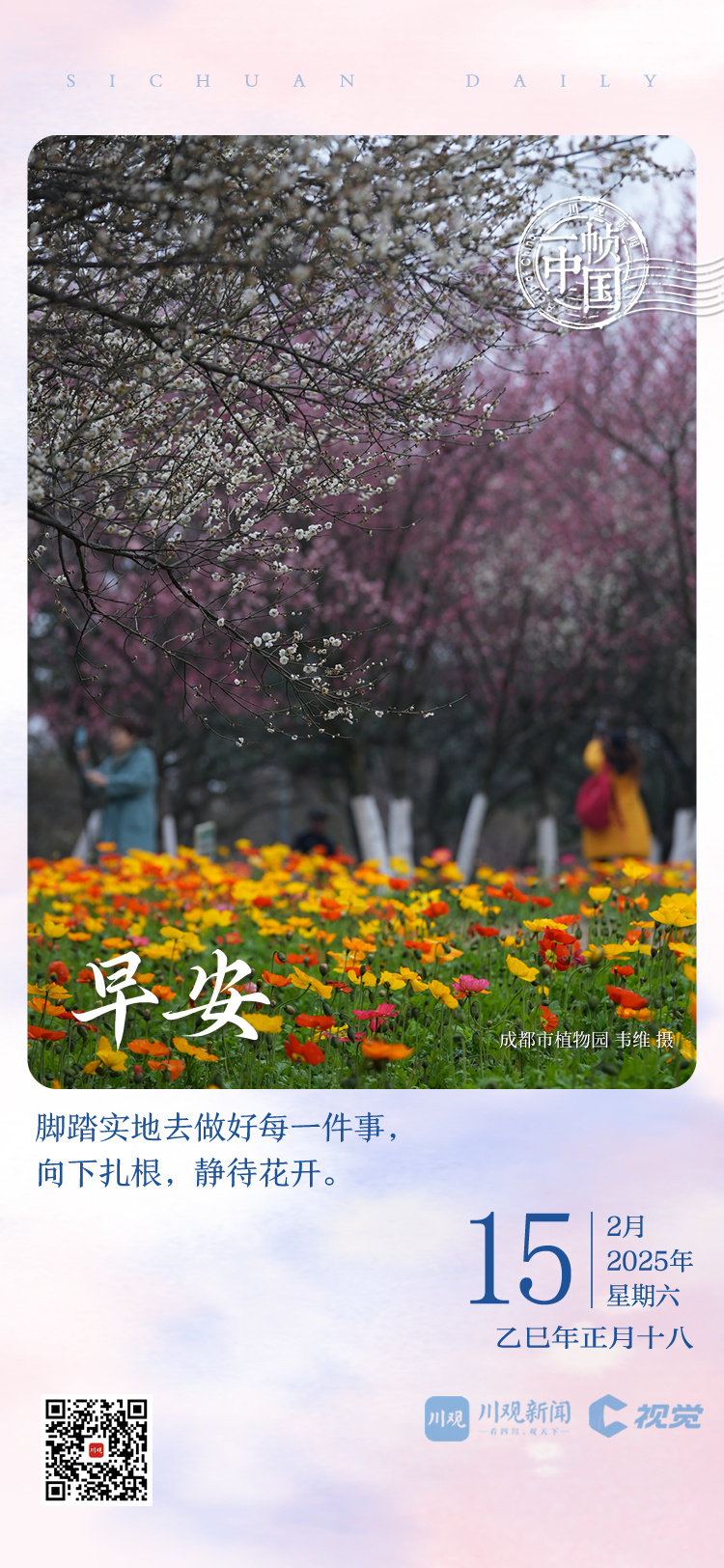 周末,跟随川观新闻到成都植物园赏花去,你看,梅花、海棠、早樱、虞美人、花毛茛等鲜花竞相盛放,满树枝头,呈现出一个粉色世界,绿色草坪,红黄鲜花相间;人生如花,要脚踏实地地去干好每一件事情,向下扎根,静待花开,待到春暖花开时,生活就更加幸福美好。