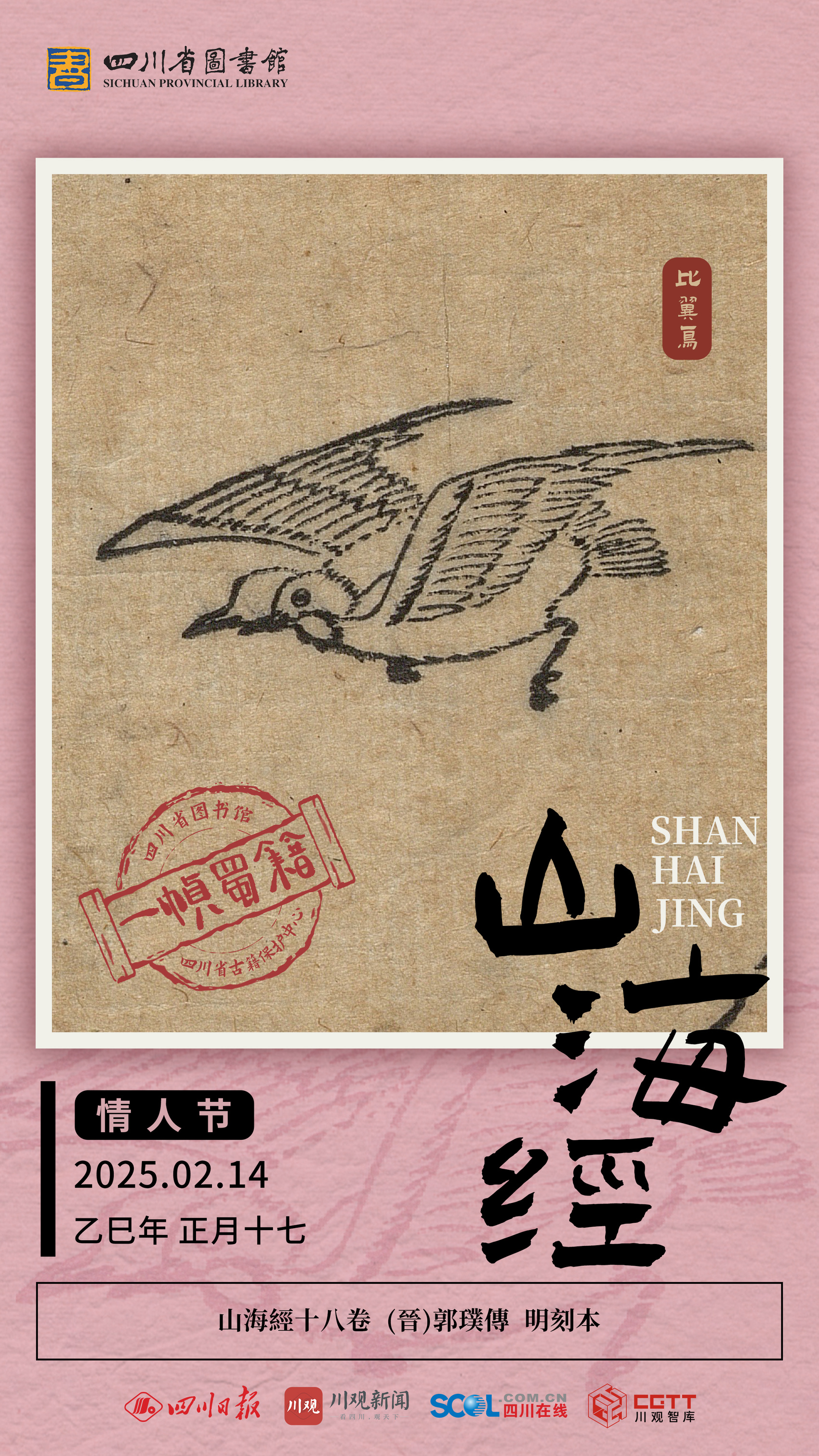 2月14日,一帧蜀籍邀您欣赏《山海经》。海报所选用图为《山海经》十八卷,由(晋)郭璞所著,版本为明刻本。