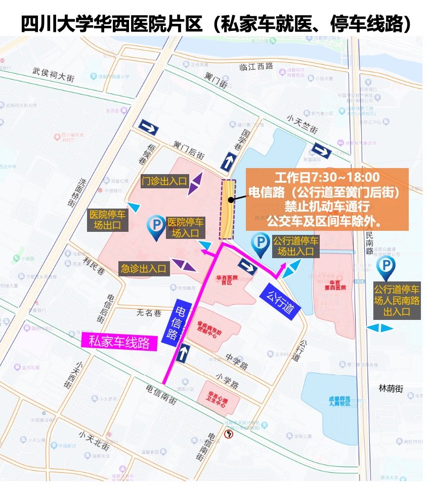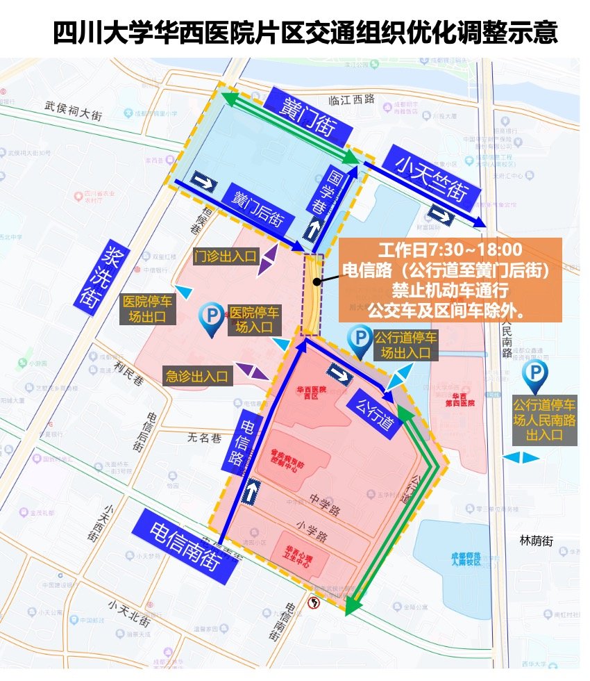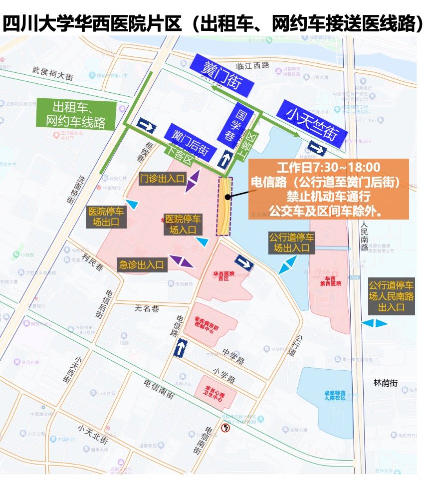 一是工作日的7:30至18:00时段,电信路(公行道至黉门后街)禁止机动车通行,公行道(电信路至华西公行道停车场出入口)实施由西向东单向通行。除公交车和区间车外,其他车辆不得通过电信路或公行道前往黉门后街、小天竺街方向。非就医用途的车辆请勿驶入电信路或公行道向北行驶。过境车辆可经浆洗街、黉门街等其他道路进行绕行。