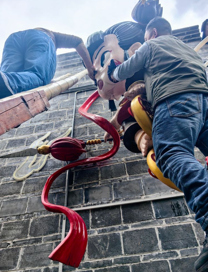 2月12日下午,记者来到冠英古街了解到,网友提到的三个哪吒雕塑,其中,躺在水中的哪吒雕塑由景区设置,已在2月6日移除;另外两个哪吒雕塑,一个位于古街屋顶,另一个在26号院前墙壁上,由此前当地商户搭建,当天下午由景区工作人员重新清洗。