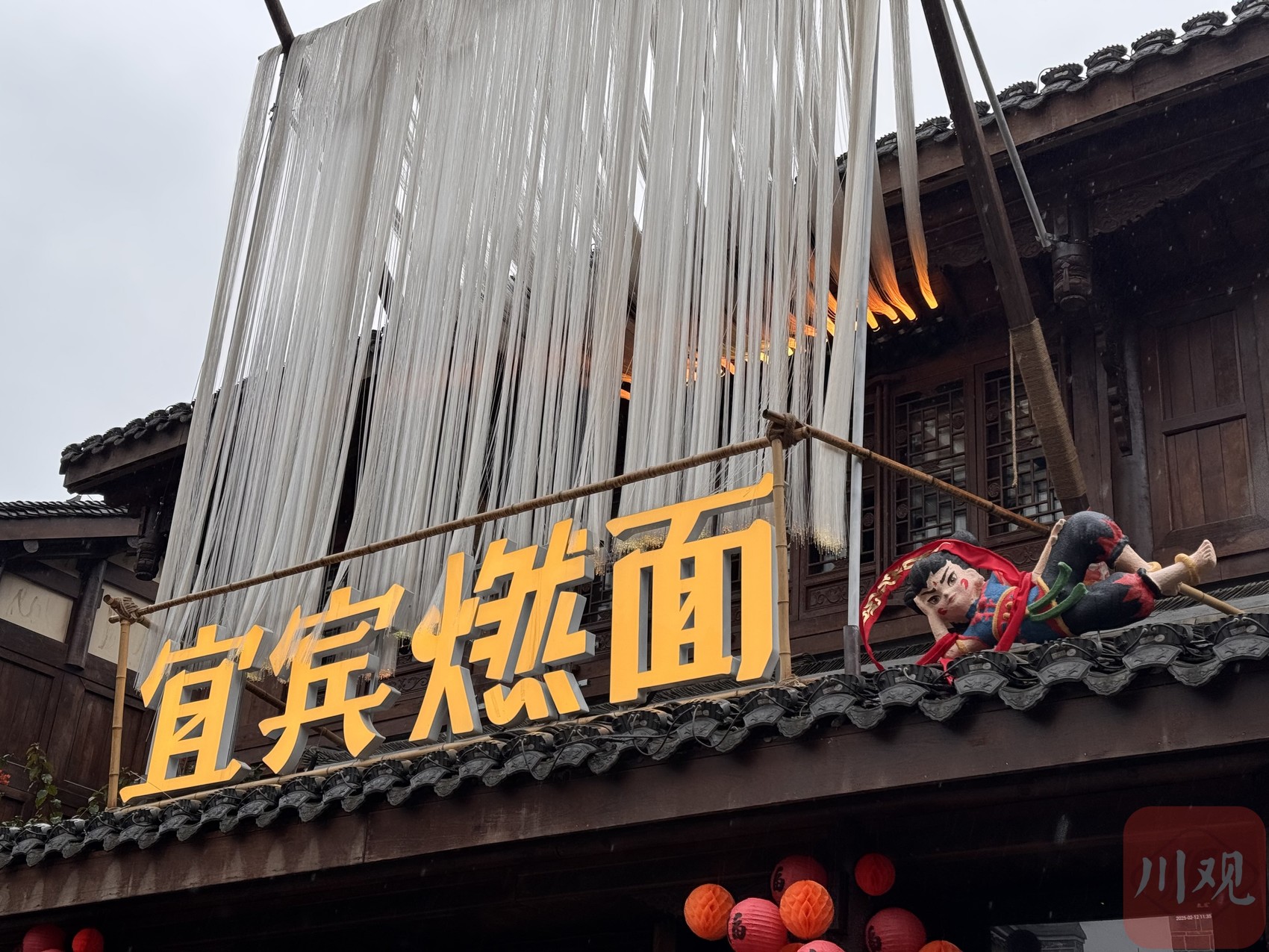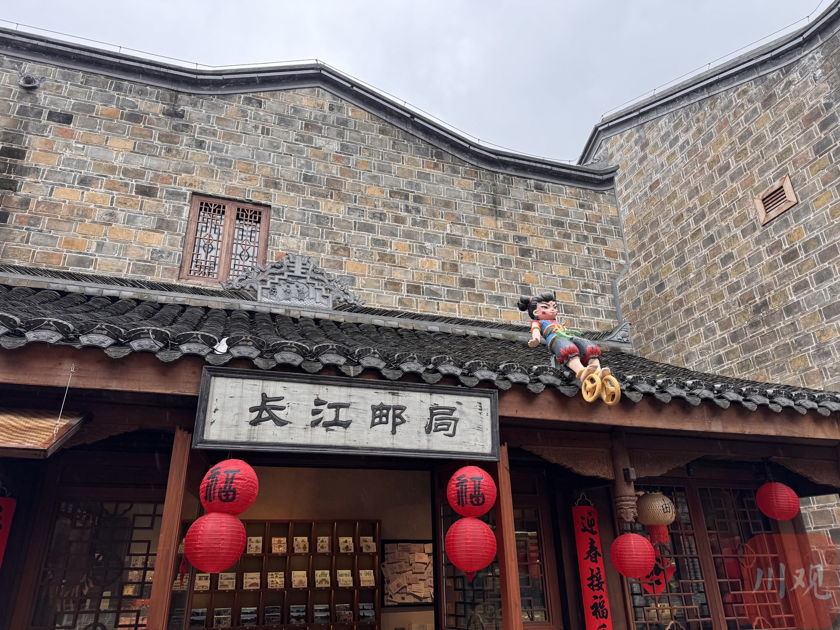 接下来宜宾冠英古街还能找到哪吒元素吗?记者走访古街看到,在长江邮局和宜宾燃面店铺的屋檐上,各有一个哪吒雕塑,形态或躺或坐,动作更加生动逼真;整体尺寸较此前的哪吒雕塑更小,但细节更加精美。