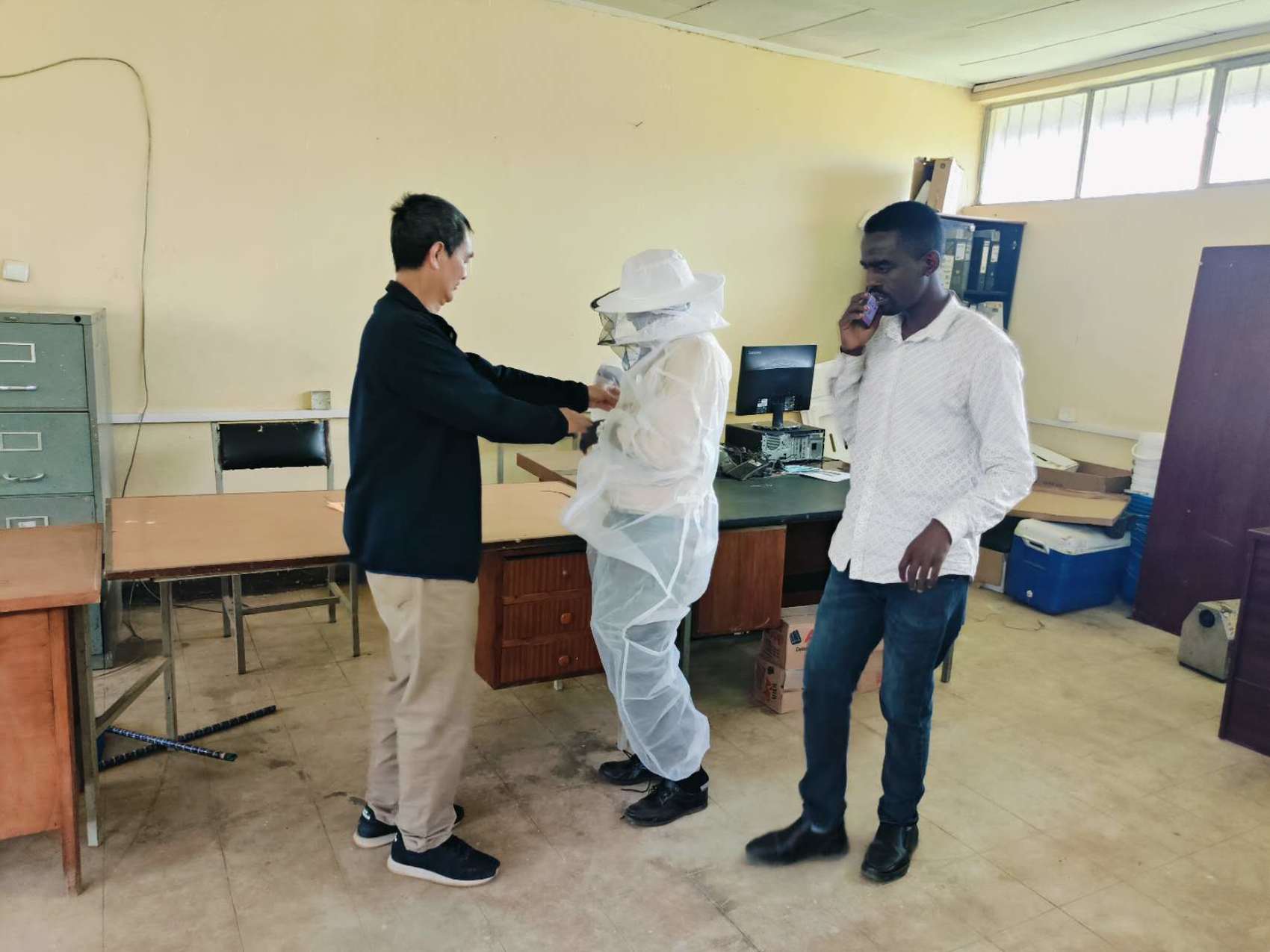 王顺海帮助学生穿防蜂服。受访者供图