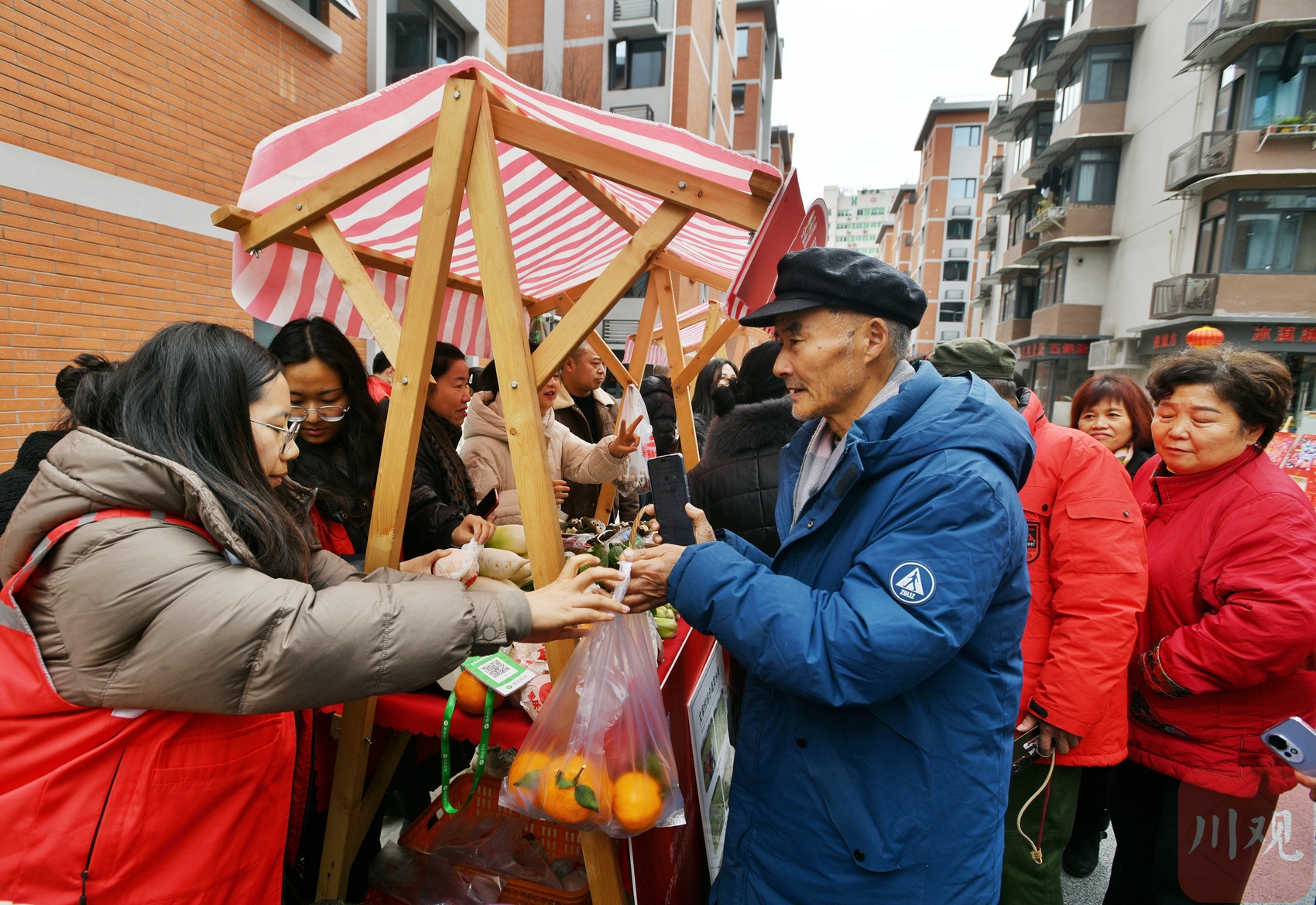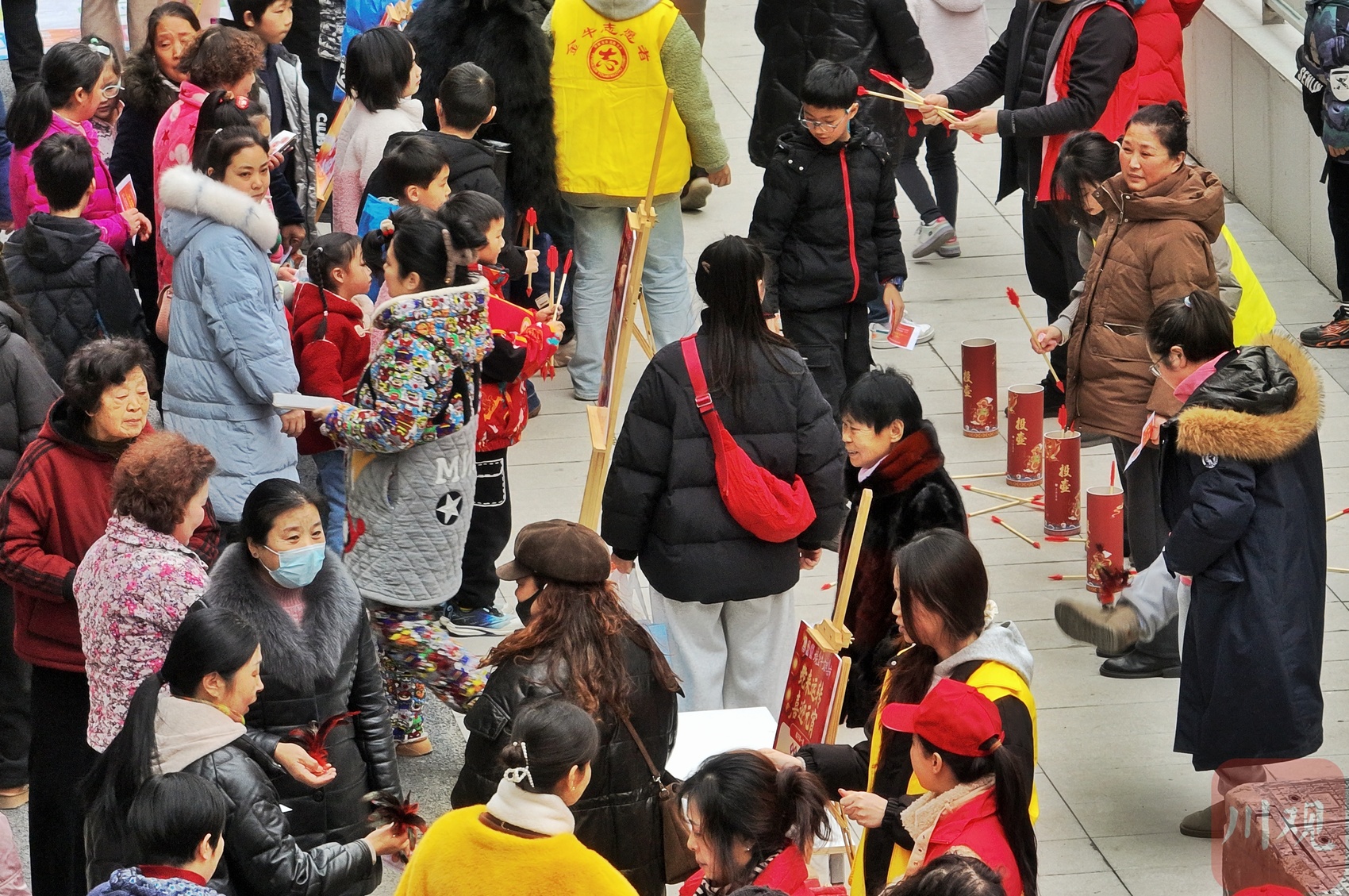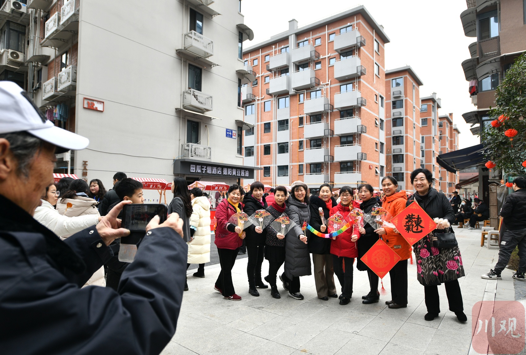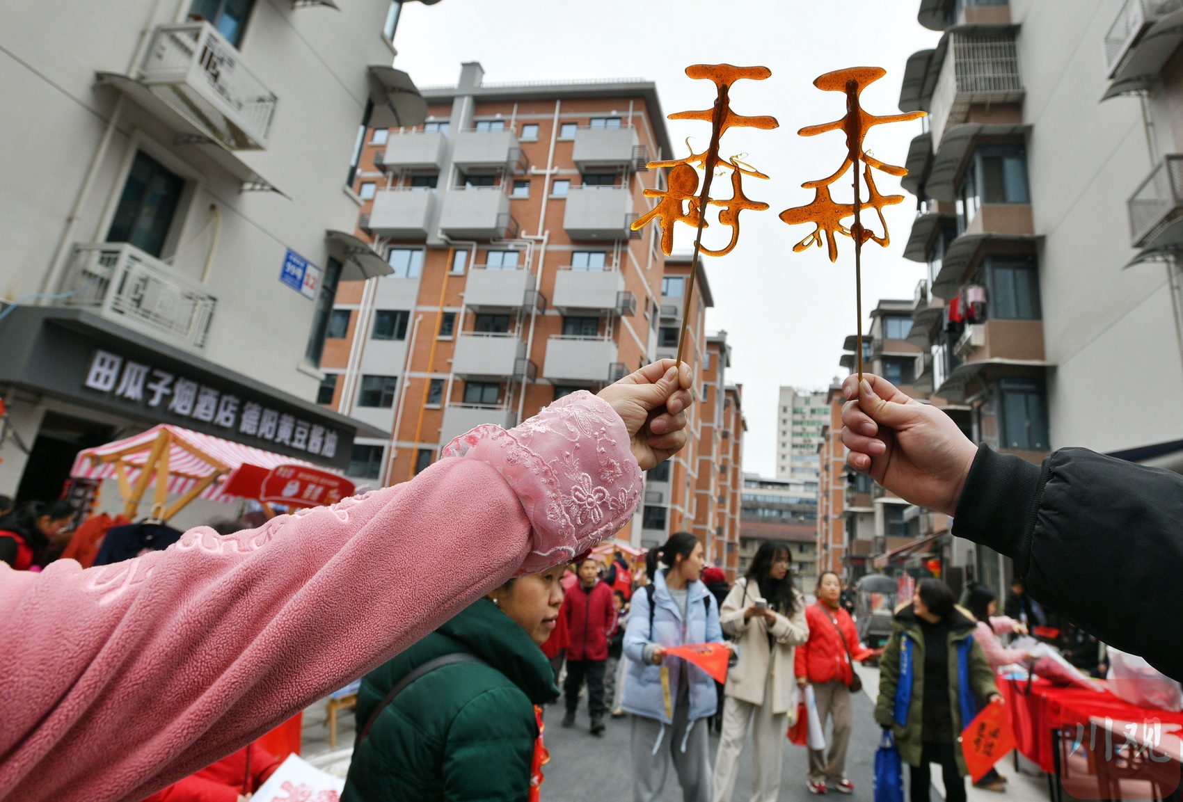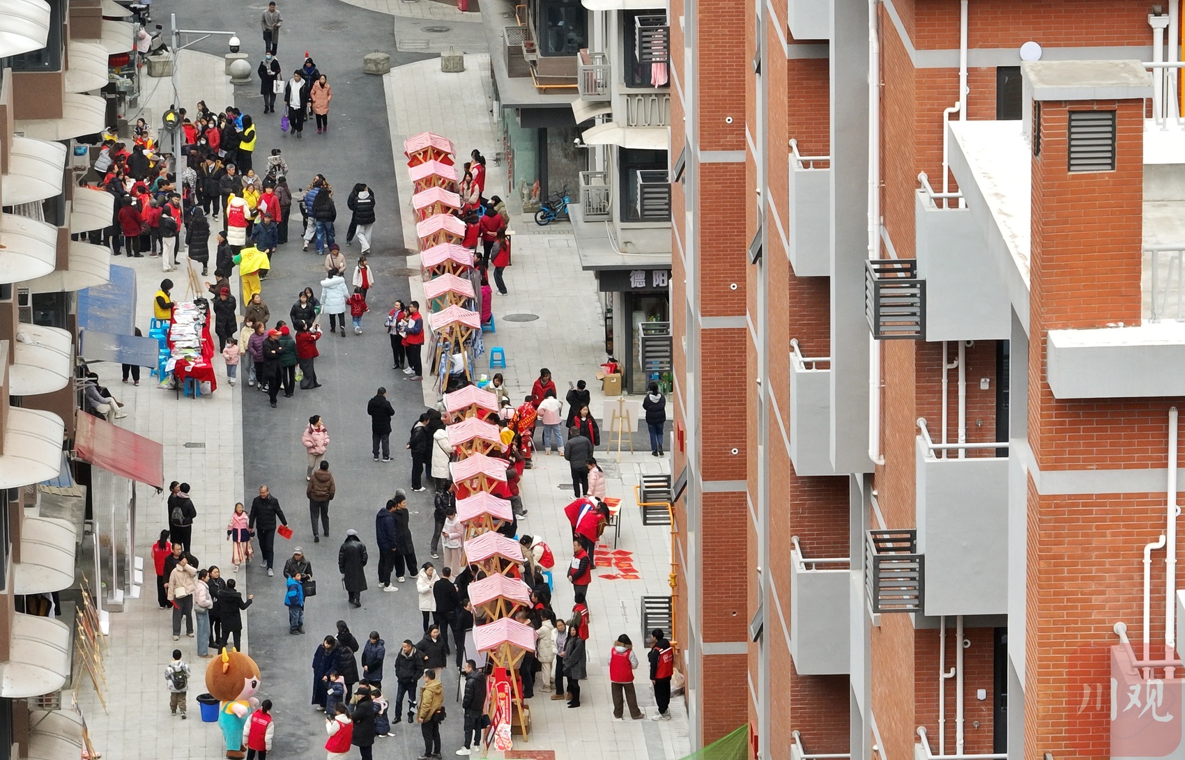 2月12日元宵佳节,下午3点,在成都老城区里的工人村社区,一场热热闹闹的非遗集市在新建居民楼前开启。现场不仅有促销的助农产品,蜀绣、年画、剪艺、糖艺等非遗摊位前也围满了居民,新春游园趣味活动区域更是吸引了社区的小朋友们,滚铁环、踢毽子、投壶、垃圾分类飞行棋……现场笑声不断。