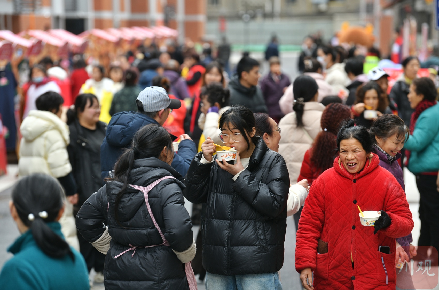 在包汤圆区域,社区大姐、大妈们围着简易桌台忙碌,不一会儿锅里的汤圆已煮好,居民们端一碗汤圆,举着年画,拿着灯笼,开开心心庆祝元宵节。