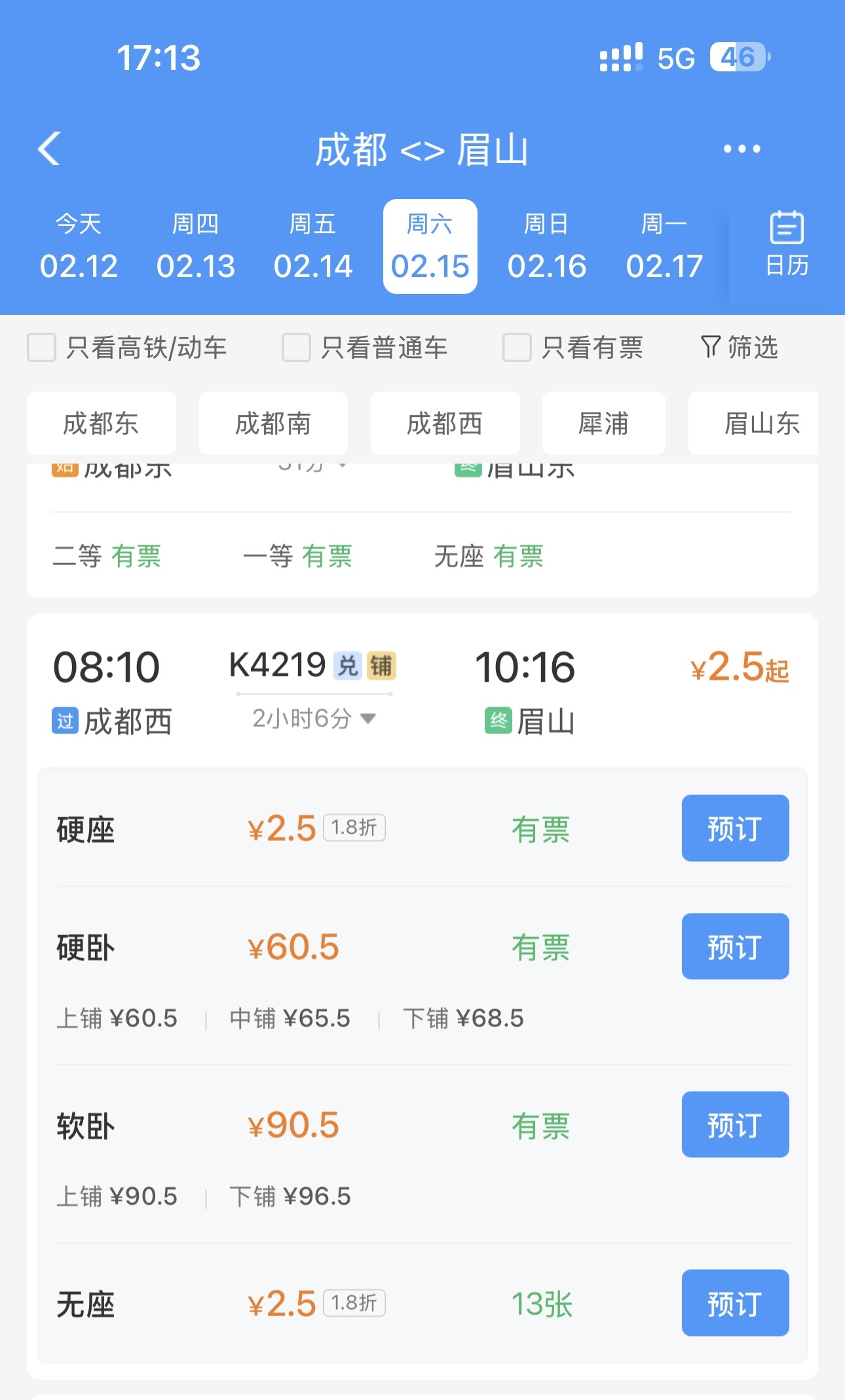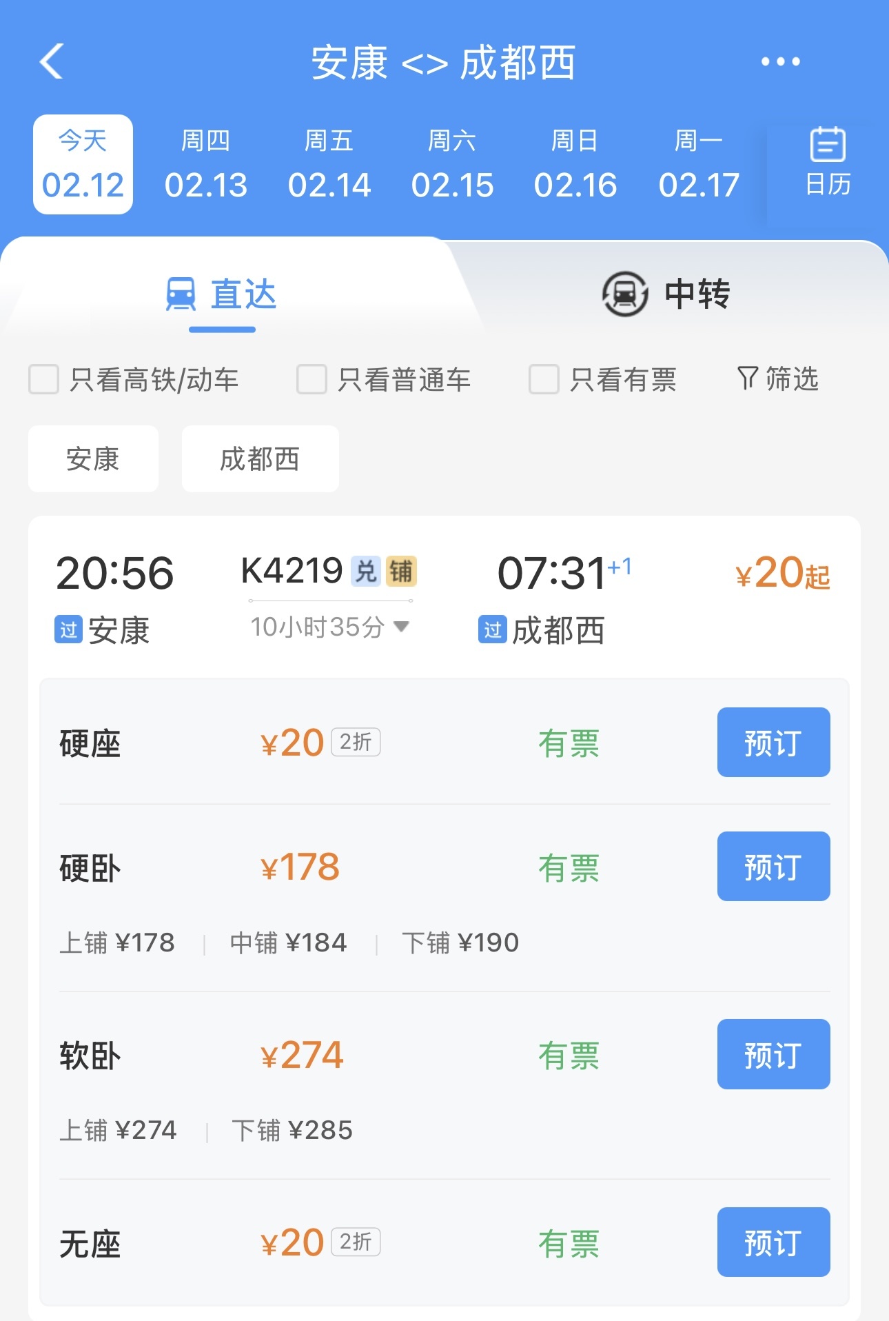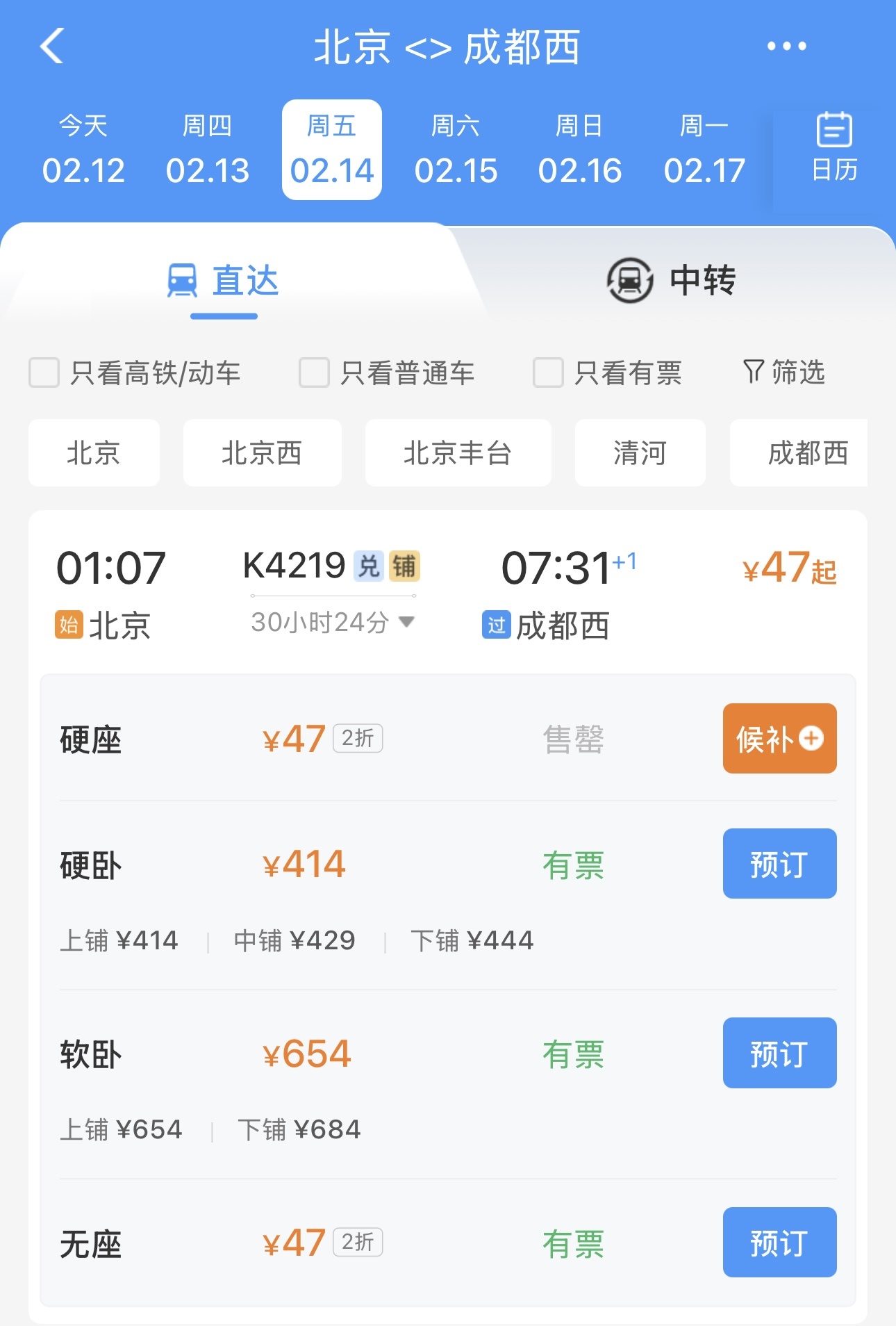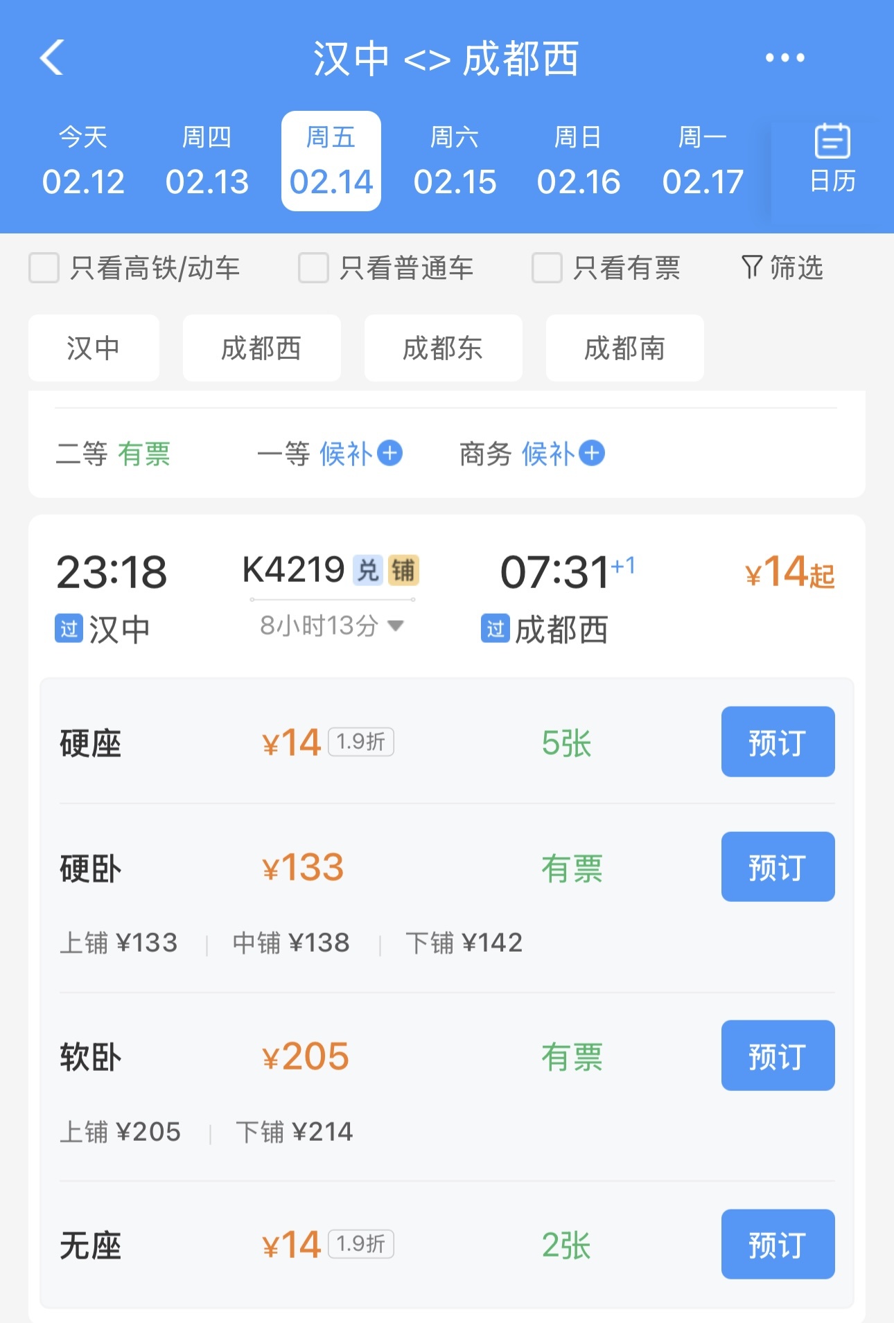 记者查询12306官网发现,近期从成都西出发和到达成都西有打折优惠。比如,2月15日,成都西—眉山K4219次列车,运行时间2小时6分,硬座票价低至1.8折、仅2.5元;2月14日,北京—成都西30小时硬座仅需47元,汉中到成都西硬座14元;2月12日,安康到成都西硬座20元,票价均低至2折。