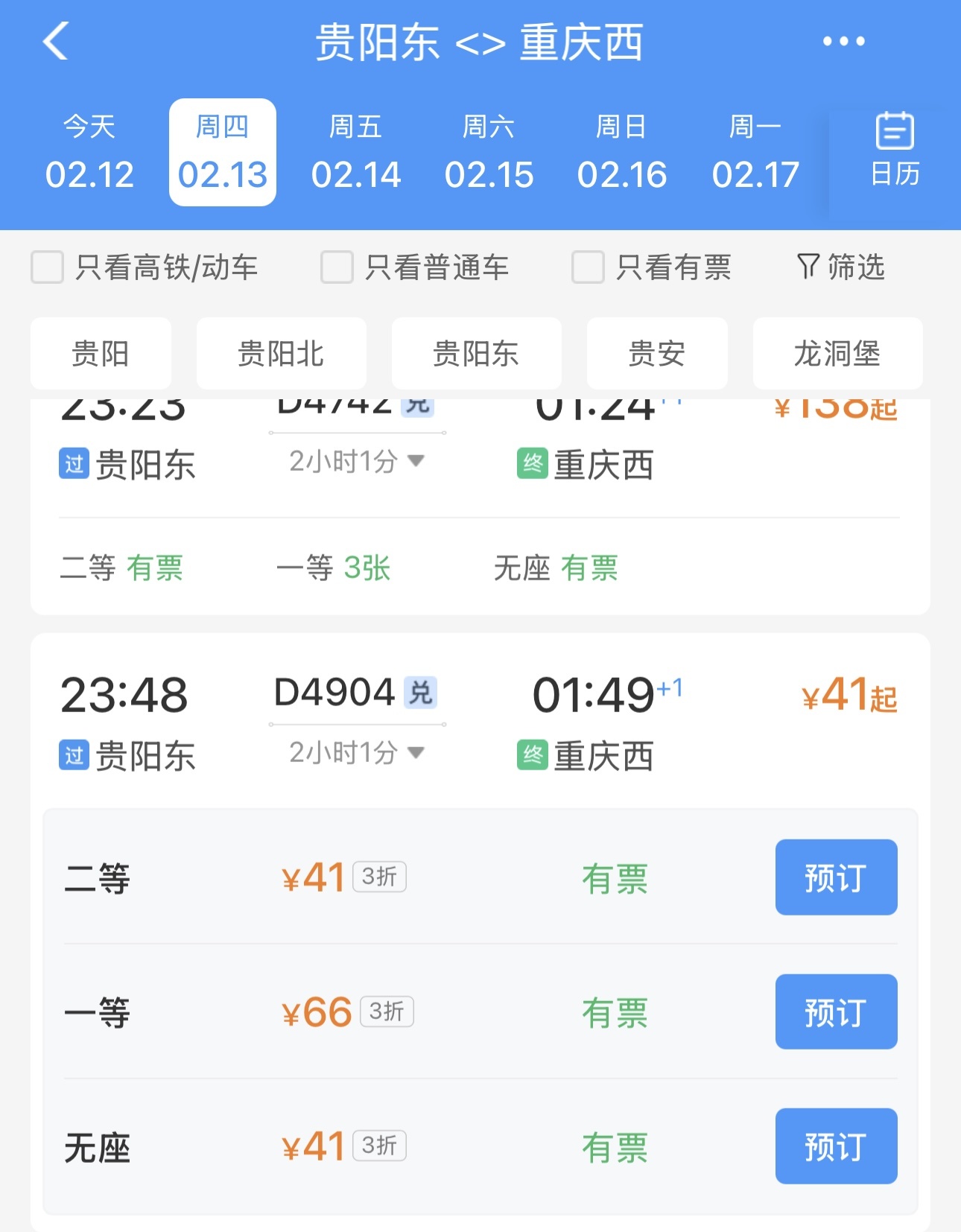 不只普速车,动车票也打折。近期,贵阳东至重庆西的D4904次列车,运行2小时1分,票价3折,二等座41元、一等座66元。