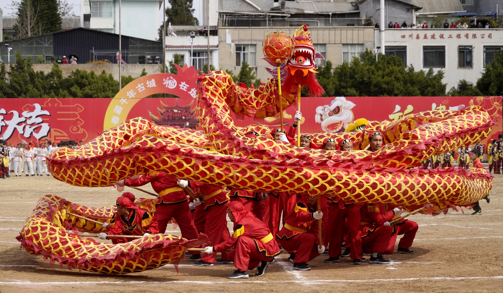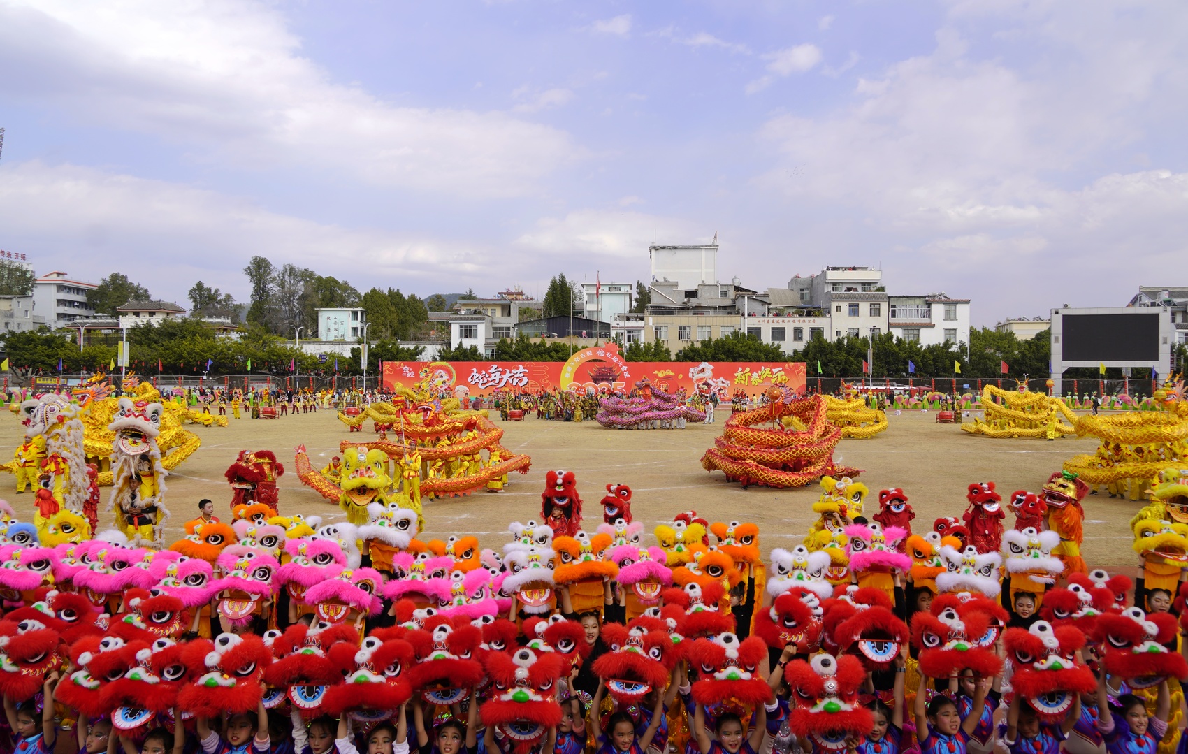 15时,各巡游队伍到达体育场,正式开始表演。女子群舞《像花一样》开场,接着由各乡镇(街道)组成的10支龙狮队轮番上场,队员们神采飞扬,舞动的长龙如蛟龙出海、蜿蜒游走,灵动的狮子四处跳跃、翻转腾挪;省级非物质文化遗产彝族长号、蹢脚舞表演点燃了整个现场……各乡镇(街道)的表演各具特色,铿锵的音乐响遍全场。