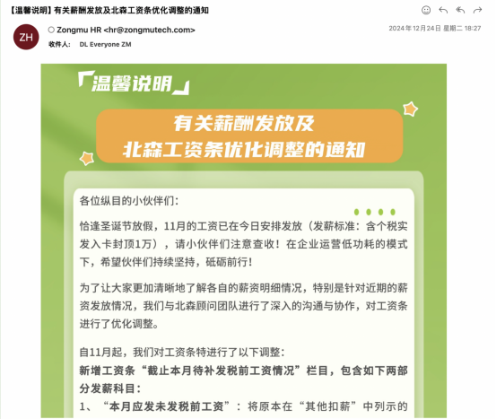 1个月后的12月24日,纵目科技第二次发送全员邮件,宣布进入低功耗模式,同时发放11月工资,封顶发放1万元。